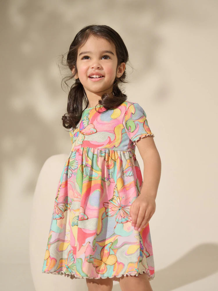 |Girl| Vestido De Malha Canelada De Manga Curta Com Borboleta Arco-Iris (3 meses a 7 anos)