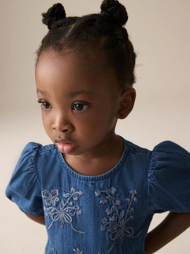 |Girl| Vestido Jeans Bordado Azul (3 meses a 8 anos)