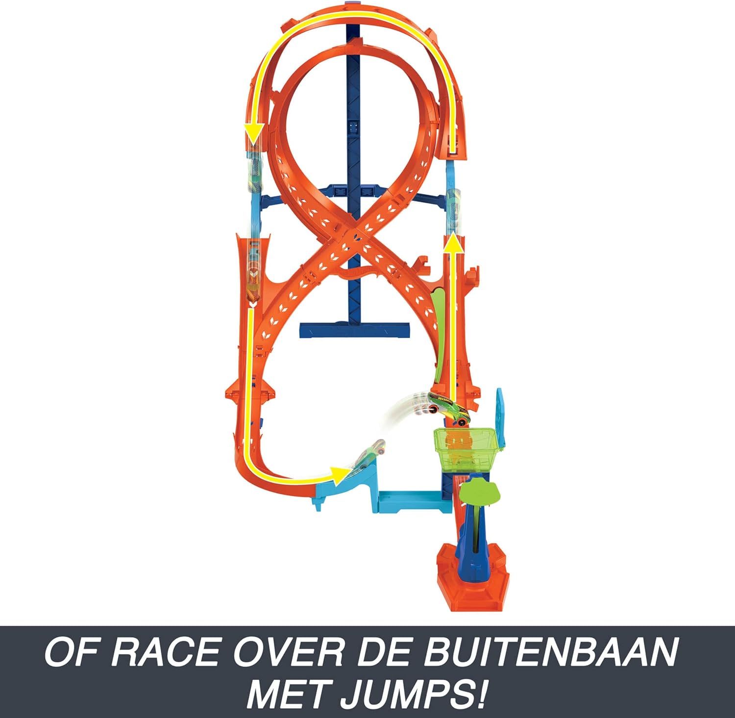 - Escolha entre 2 pistas diferentes, cada uma com suas próprias características exclusivas, para correr e fazer acrobacias no conjunto de pista Hot Wheels Action Vertical-8 Jump.