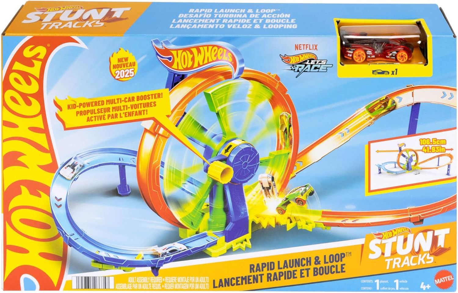 - O conjunto Hot Wheels Rapid Launch & Loop Playset apresenta uma manivela que impulsiona os carrinhos através de um loop, curvas e uma zona de colisão repetidamente.