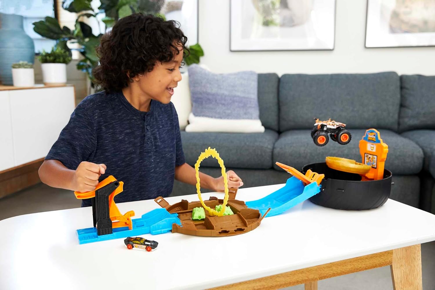 - O conjunto Hot Wheels Monster Trucks Stunt Tire impressiona tanto aberto quanto fechado! O pneu gigante do monster truck comporta uma pista de acrobacias com mais de 89 cm de comprimento e inclui uma alça para facilitar o transporte quando fechado.