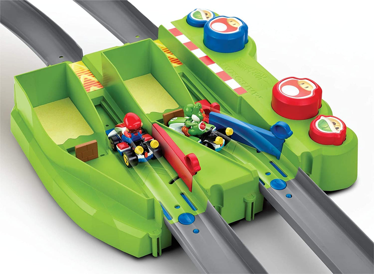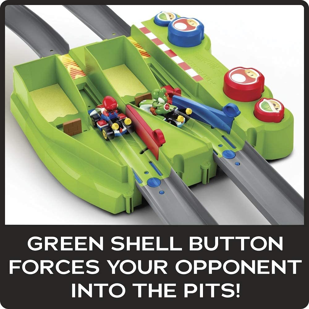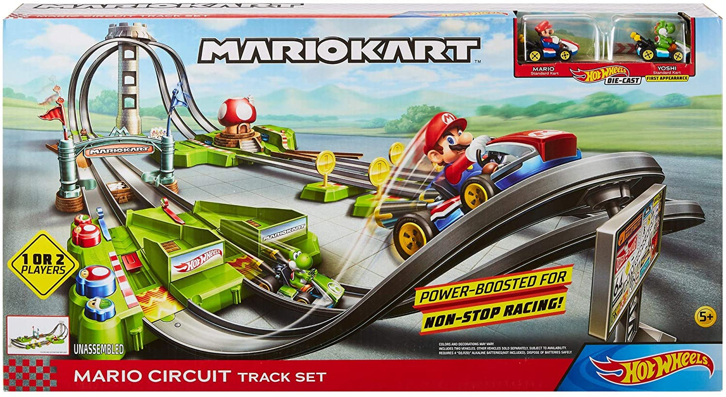 O conjunto de pistas do circuito Mario Kart inclui um kart fundido sob pressão Yoshi e um kart fundido sob pressão Mario.