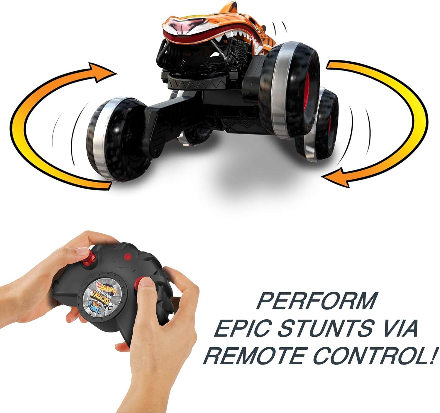 Hot Wheels Monster Trucks, Tubarão Tigre Imparável com Pneus Tread Attack e Tecnologia Terrain Stomp, Dirija em 2 Rodas, Inclui Controle Remoto, Brinquedos para Maiores de 4 Anos, HGV87