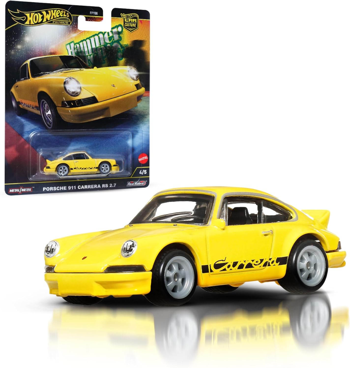 - Este modelo Porsche 911 Carrera RS 2.7 em escala 1:64, feito em metal fundido, possui acabamento premium com pneus Real Riders e carroceria e chassi de metal.