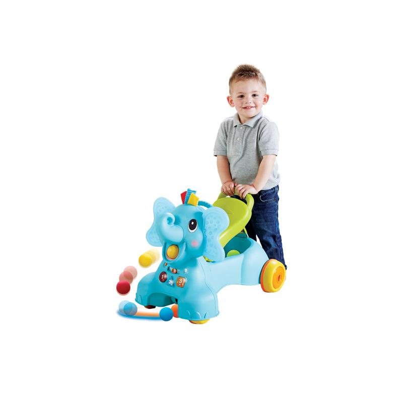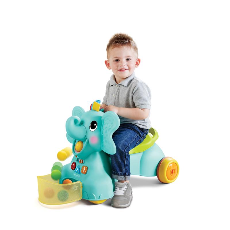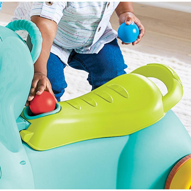 Ao sentar-se, seu bebê pode explorar as atividades, apreciar sons e luzes e brincar com bolas coloridas. O jogo de bola pop 'n scoop incentiva os primeiros passos no modo Walker do Elefante. No modo Ride on, seu filho pode se divertir muito coletando as bolas movendo-se. O armazenamento sob o assento ajuda a armazenar as bolas e outros tesouros.