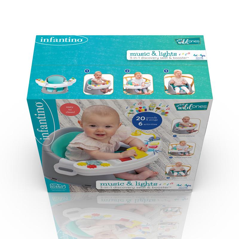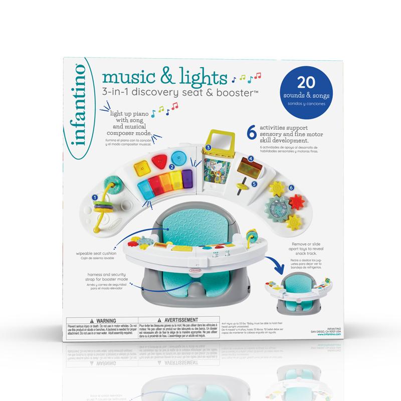 Music & Lights 3 em 1 Discovery Seat & Booster é um local de jogo interativo, assento para lanches e reforço seguro em um só.