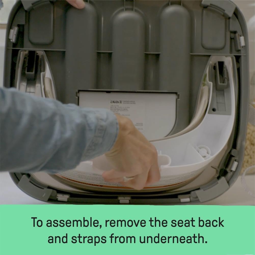- Para montar a Base Ingenuity Baby, retire a bandeja, vire o assento e retire o encosto de baixo da base (dica: as alças da cadeira também ficam guardadas embaixo do assento) e coloque o encosto no topo da base; parte traseira não removível após a instalação