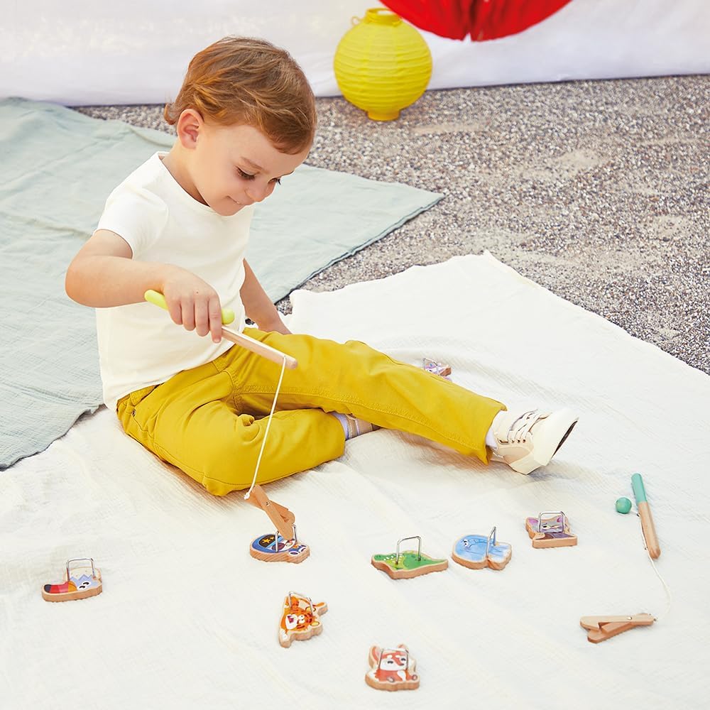- CARACTERÍSTICAS: Contém 2 varas de pesca com garras, 10 animais de madeira FSC decorados com tinta à base de água e equipados com gancho de metal, 1 bolsa e 1 conjunto de linha de pesca sobressalente - Este brinquedo Janod é adequado para crianças de 3 a 6 anos - Dimensões: 25 x 4,5 x 25 cm - Para 2 jogadores