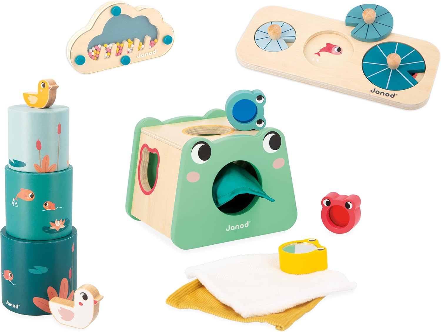 - CONTEÚDO DA CAIXA: Descubra uma seleção escolhida a dedo de brinquedos de aprendizagem precoce Janod. Esta caixa de brinquedos para crianças de 1 ano contém uma caixa sensorial de classificação de formas com 3 sapos de encaixe, um lado inclinado e 3 tecidos de texturas diferentes. Além disso, esta caixa de jogos para bebés de 1 ano inclui 3 peças de cartão empilháveis, 2 patos grossos, um bastão de chuva de nuvens e um puzzle de nenúfares, para oferecer ao bebé uma experiência de jogo sensorial completa.