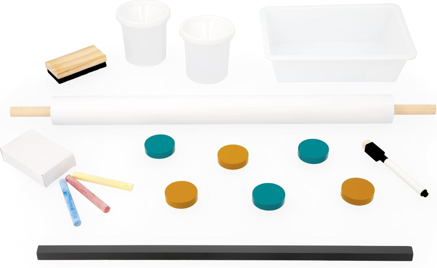 Janod - Cavalete de madeira dupla face - Evolutivo, altura ajustável - Quadro branco magnético + quadro negro + rolo de papel - 23 acessórios incluídos - A partir de 3 anos, J09625