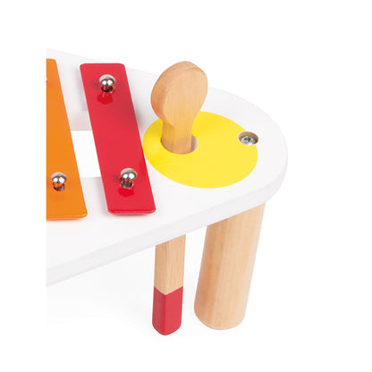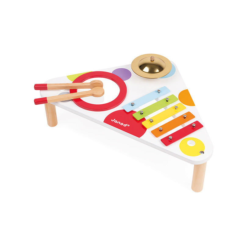 Mesa musical composta por um xilofone, um prato e um tambor. Inclui 2 marretas. Vermelho, amarelo, verde, laranja ...