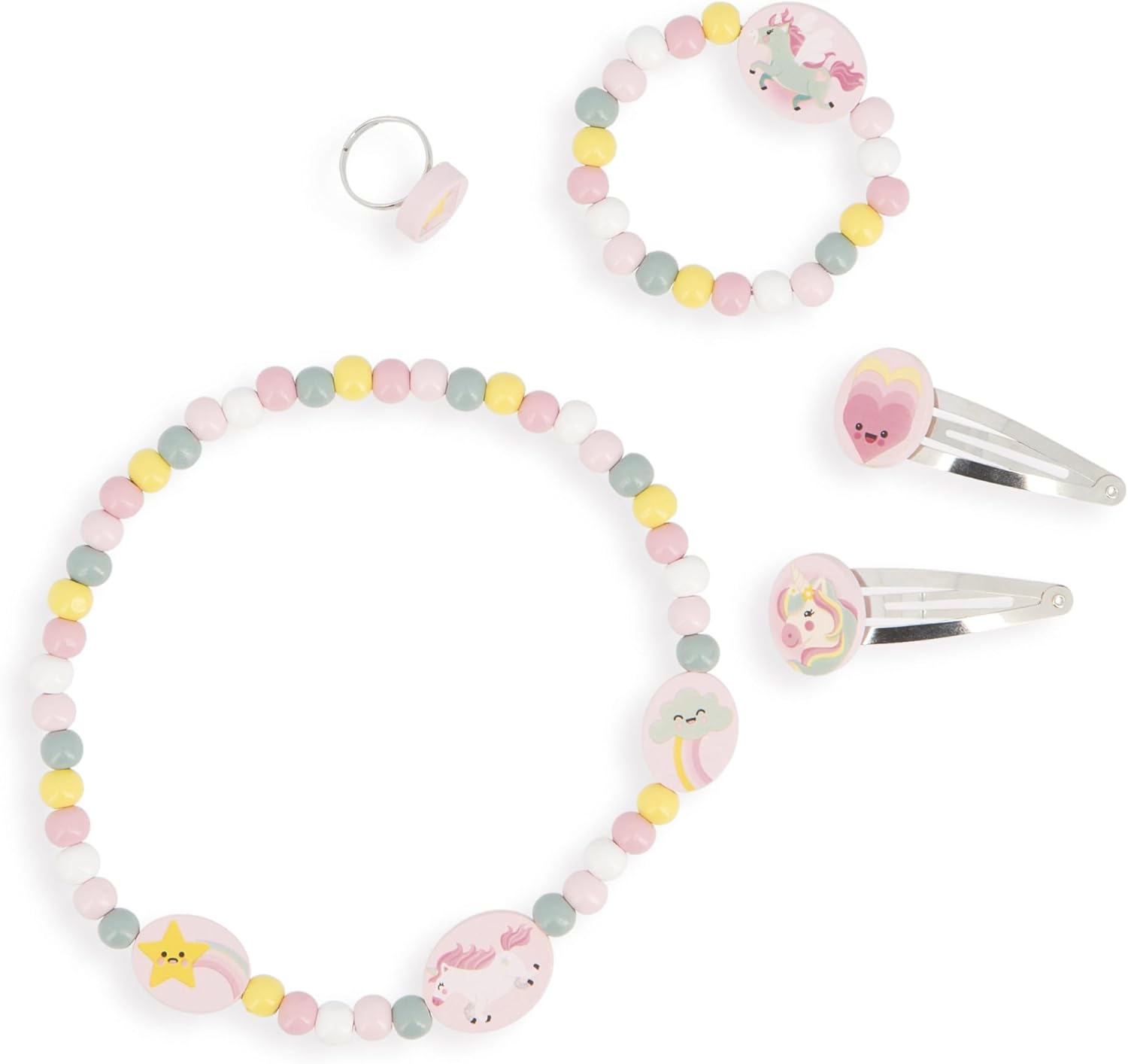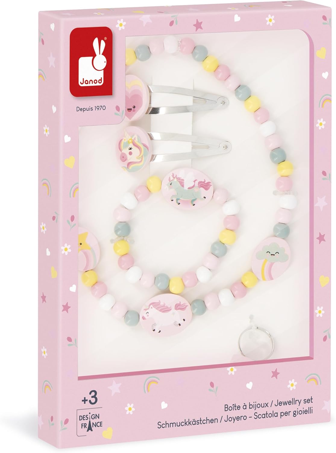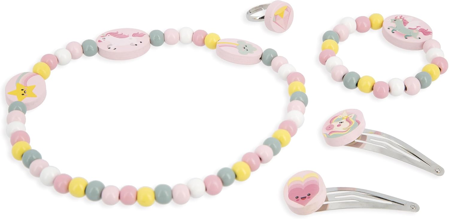 Janod - Conjunto de 5 joias de madeira de unicórnio - 1 colar, 1 pulseira, 1 anel e 2 clipes - Joias de madeira e metal FSC - Acessório de moda - A partir de 3 anos - J08880