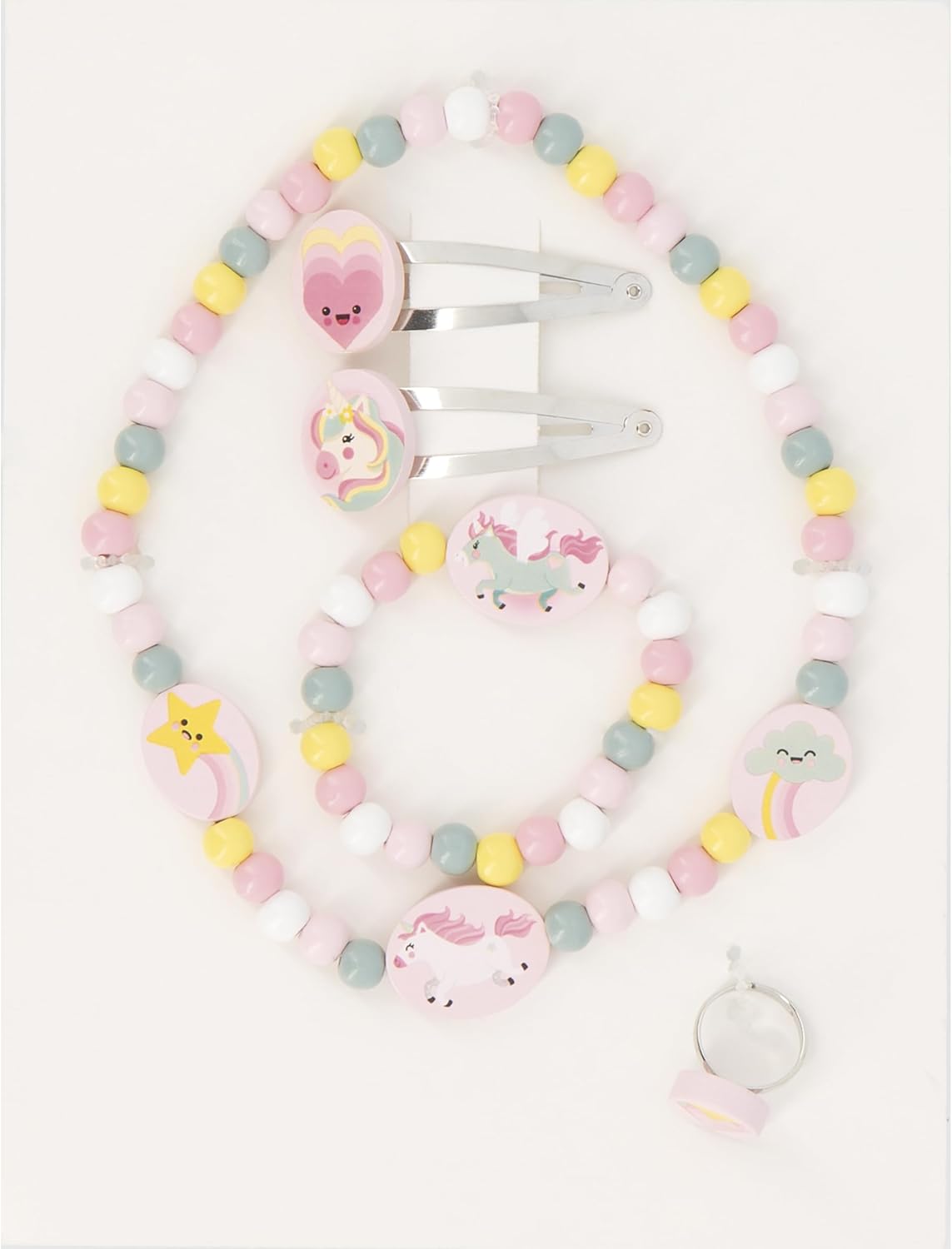 - Este conjunto de 5 joias de unicórnio para crianças a partir de 3 anos inclui um colar, uma pulseira, um anel e duas presilhas. Cinco joias de madeira para brilhar em toda a sua glória e criar um look mágico que combina com seu penteado mágico!