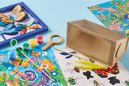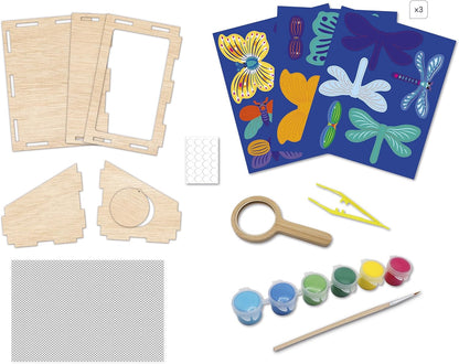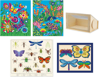 - CONTEÚDO DA PASTA: Garden Explorer é um brinquedo infantil completo. Esta maleta de atividades artesanais para crianças contém potes de tinta, 1 par de pinças, 1 pincel, 1 ferramenta de madeira, 1 imagem/pôster grande de arte em arranhões, um hotel de insetos em madeira balsa, 1 lupa de madeira, quadros, pontos adesivos, 2 imagens para pintar usando potes de tinta e 1 imagem com tema de inseto.