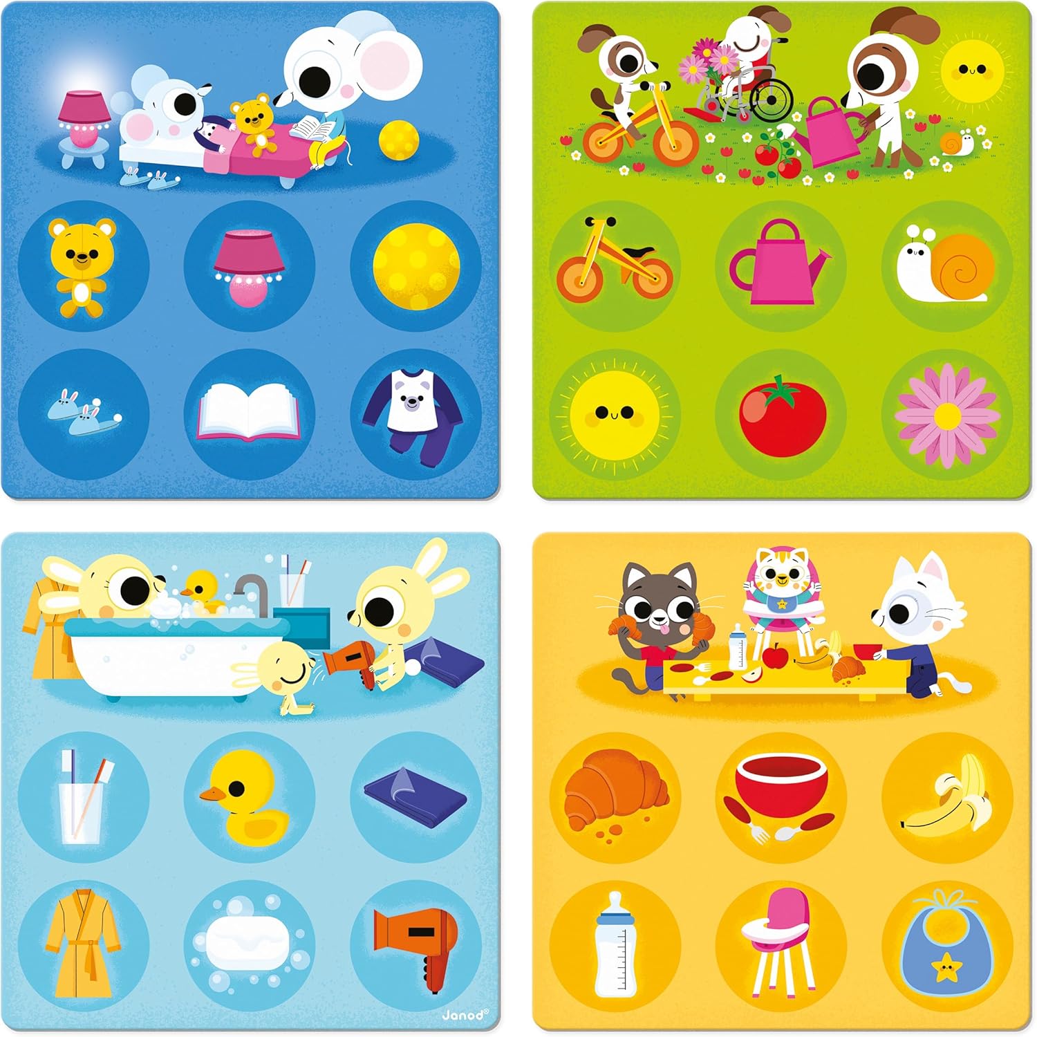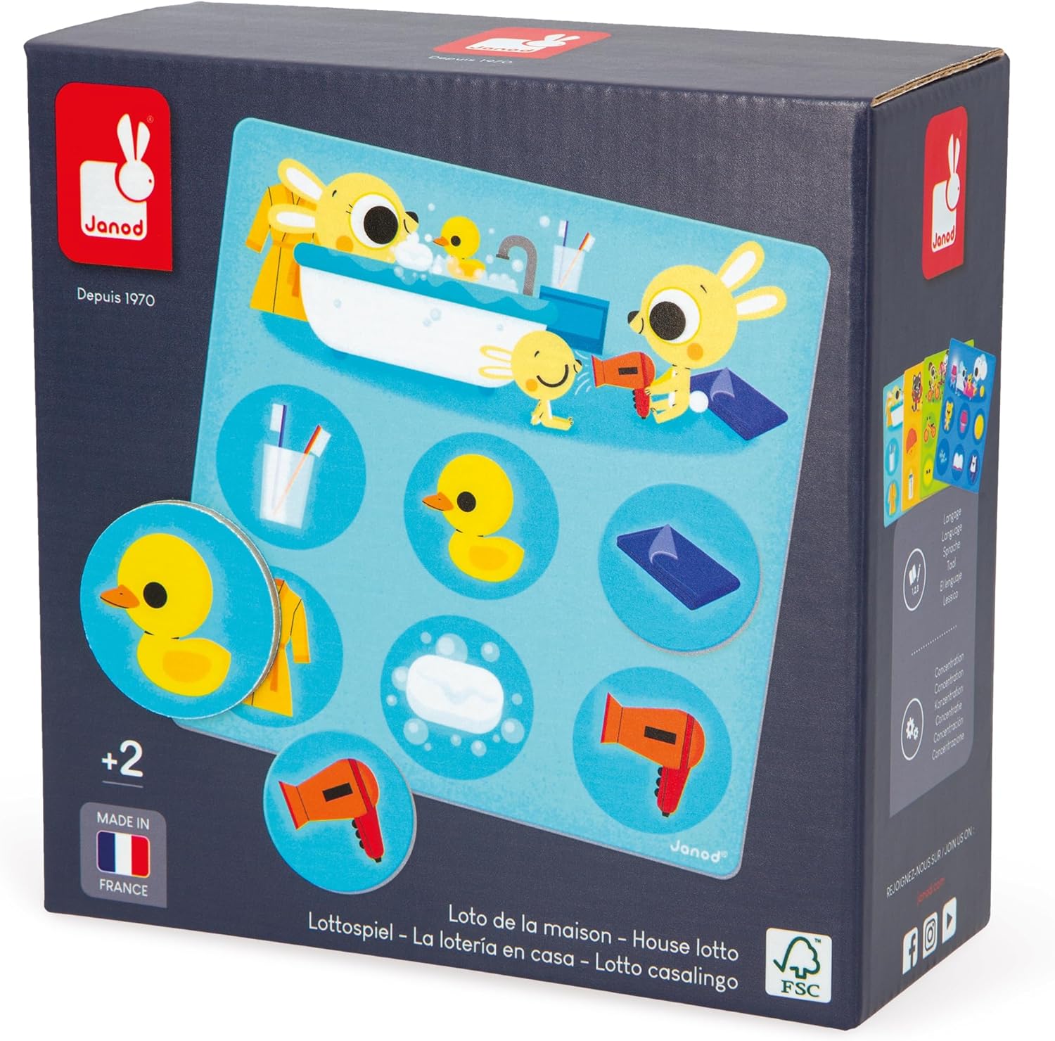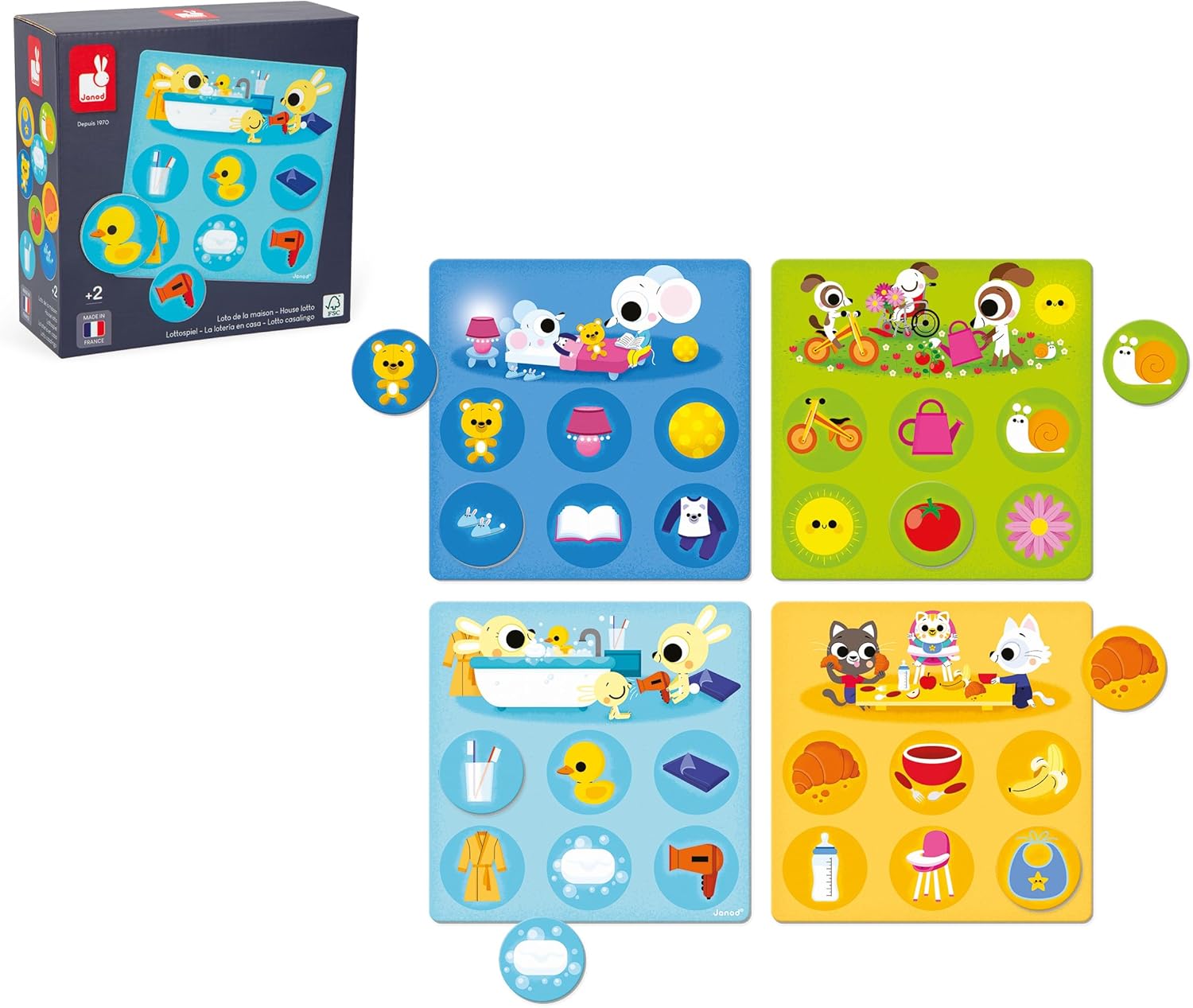 Janod - House Bingo - 4 tabuleiros e 24 fichas de papelão - Jogo educativo - Vocabulário e concentração - Tintas vegetais e certificadas pelo FSC - Fabricado na França - 2 anos +,