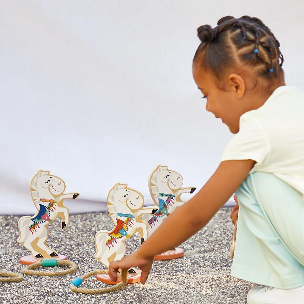 - UM JOGO DE LANÇAMENTO DE ANÉIS REVISITADO PARA CRIANÇAS: Troque os anéis por cordas de arremesso estilo laço e pegue os cavalos. O primeiro jogador a apanhar um, dois ou três cavalos é o vencedor: tudo depende das regras que os seus pequenos vão inventar!
