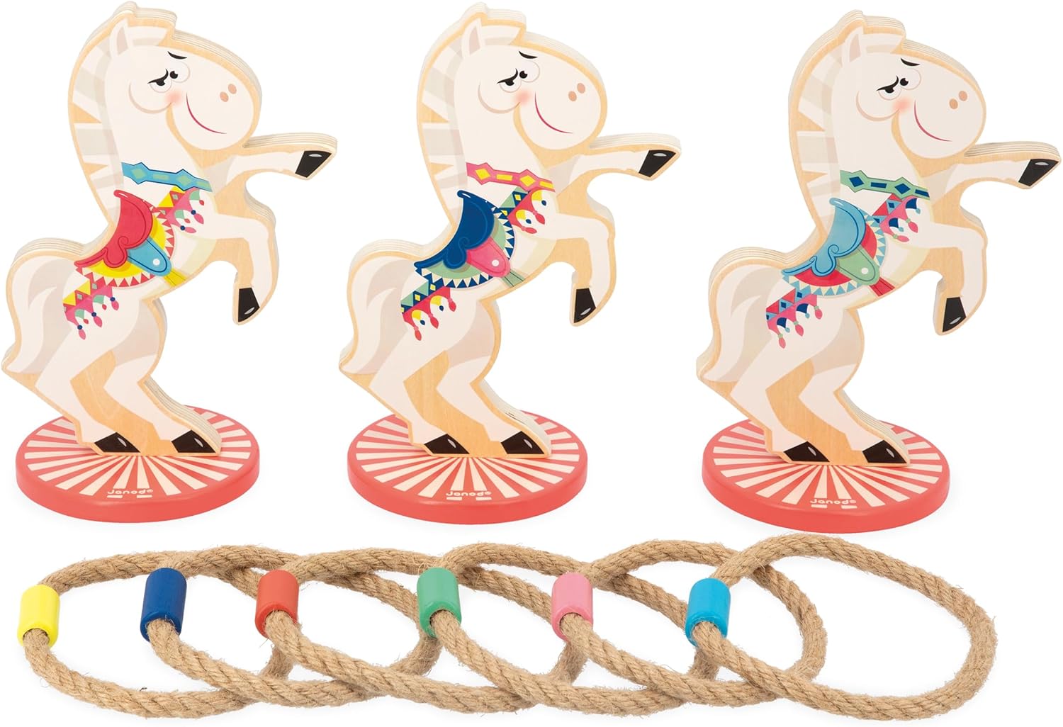 - CARACTERÍSTICAS: Este jogo ao ar livre inclui 3 cavalos de madeira FSC com impressão unilateral (13 x 10 x 20 cm) e 6 cordas de arremesso (11 cm de diâmetro) - Tinta à base de água - Este jogo Janod é adequado para crianças de 3 a 3 anos. 8 anos - Jogo outdoor para 1 ou mais jogadores