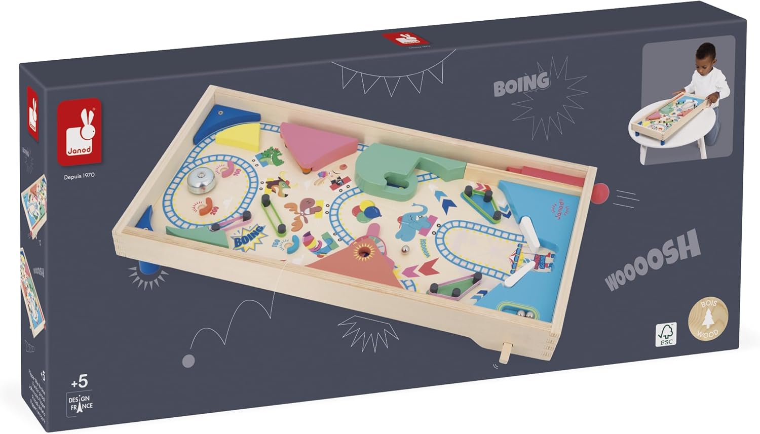 Janod - Máquina de Pinball de Madeira para Montar - Decoração de Parque de Diversões - Jogo de Ação e Reflexos para Crianças Montarem - Estratégia de Aprendizagem e Concentração - Madeira Certificada FSC - A partir de 5 anos