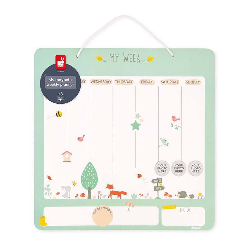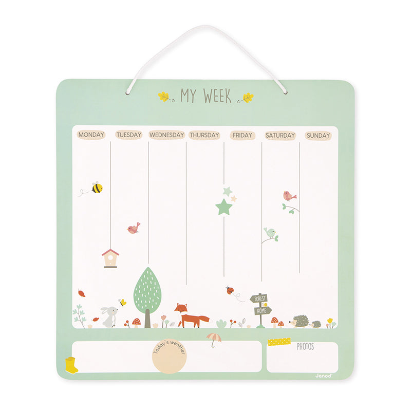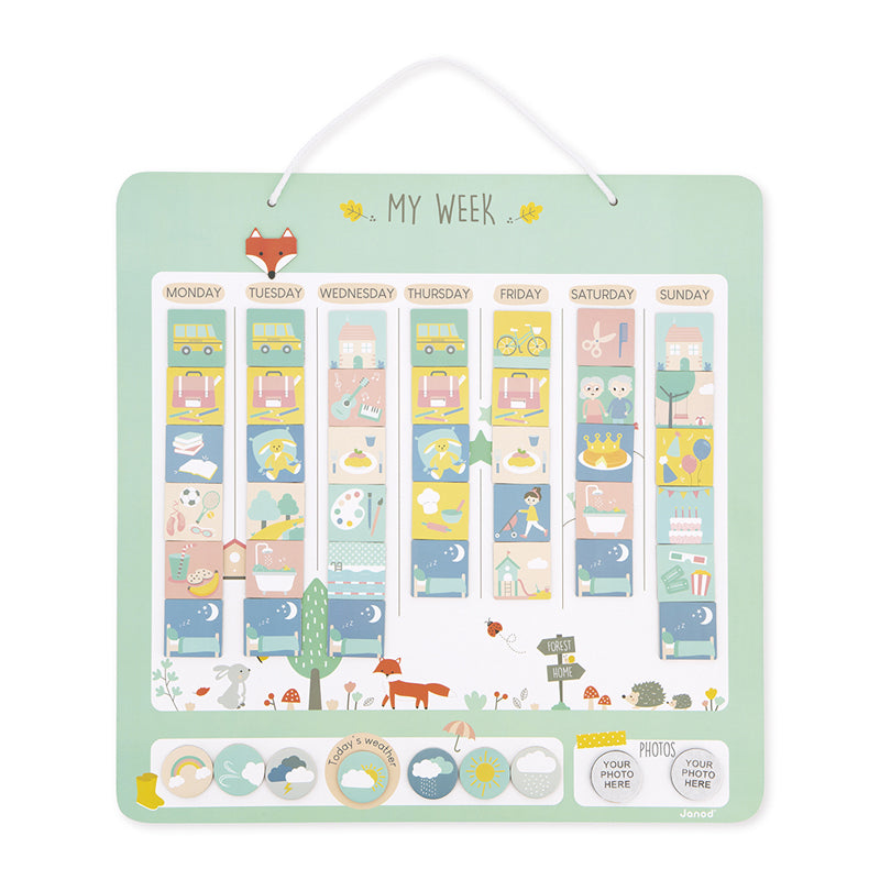 Quer organizar a semana do seu filho? Este lindo calendário semanal de madeira torna tudo mais fácil! Os muitos ímãs facilitam a visualização das atividades da semana para ajudar seu filho a se situar no tempo.