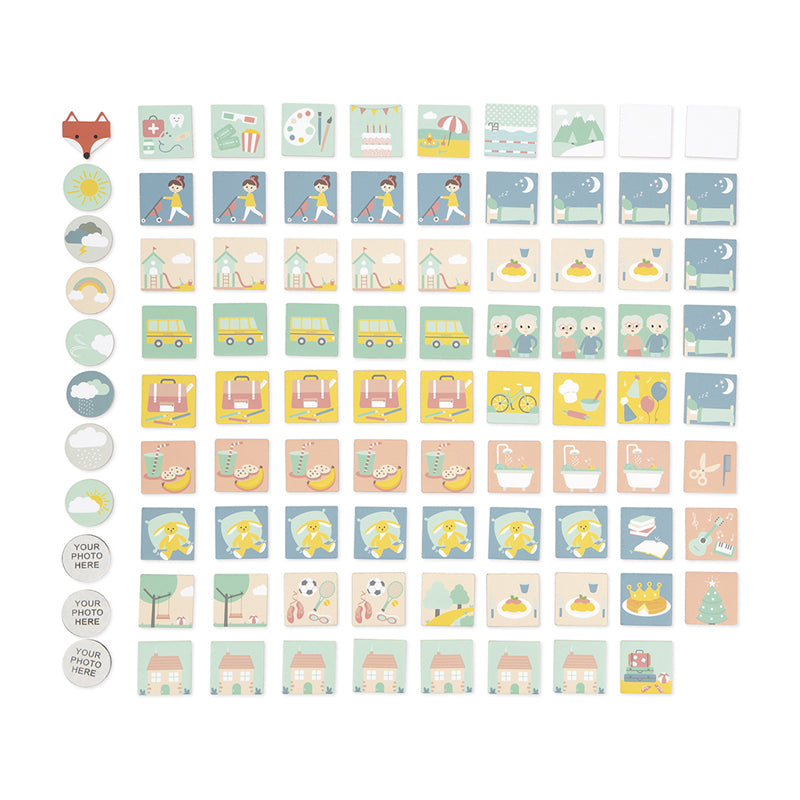 Os 78 ímãs neste conjunto representam uma variedade de atividades (incluindo viagens, escola, horário das refeições, hora de dormir, atividade para aniversários etc.). Também inclui 2 ímãs com superfície apagável que você pode personalizar com um desenho ou frase, 7 ímãs com tema climático, 3 ímãs que você pode personalizar com uma foto e, finalmente, 1 ímã com um lindo rosto de raposa para indicar o dia da semana .