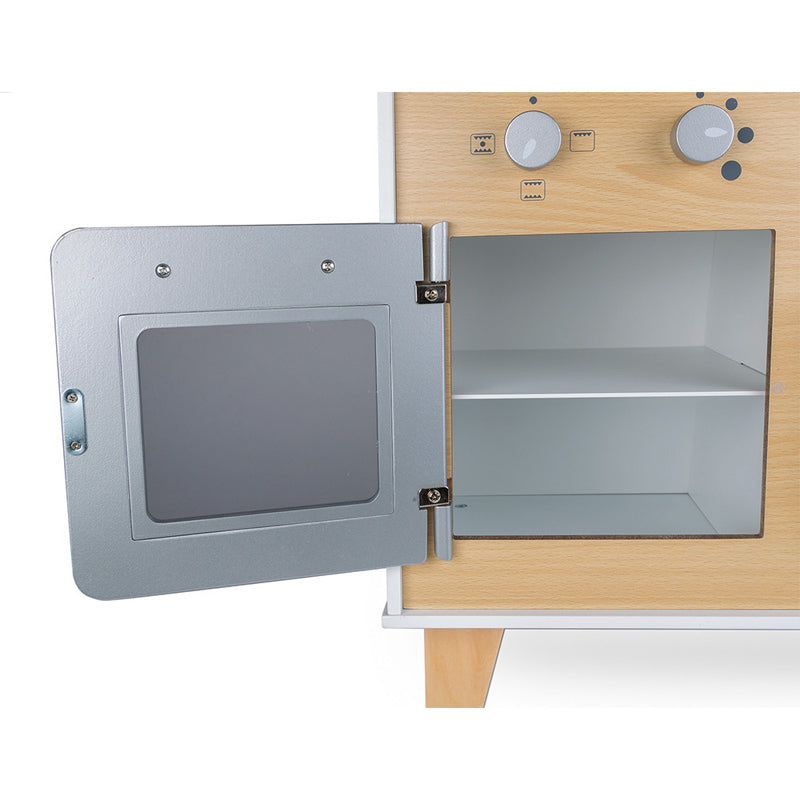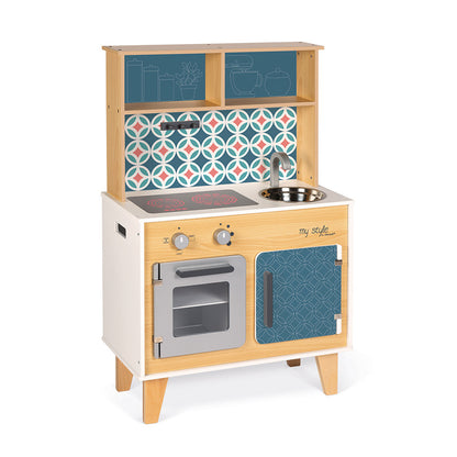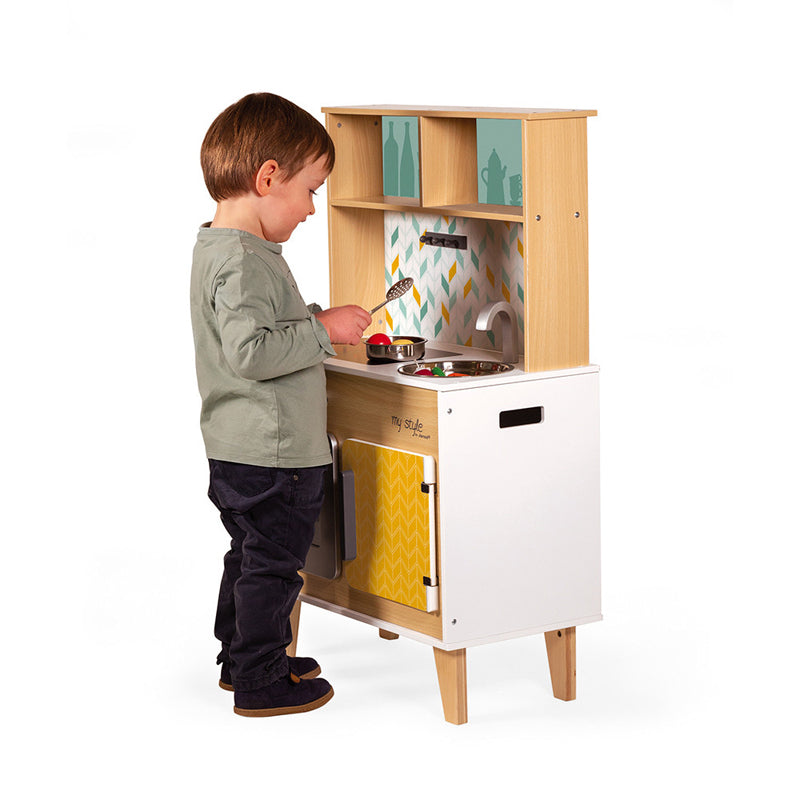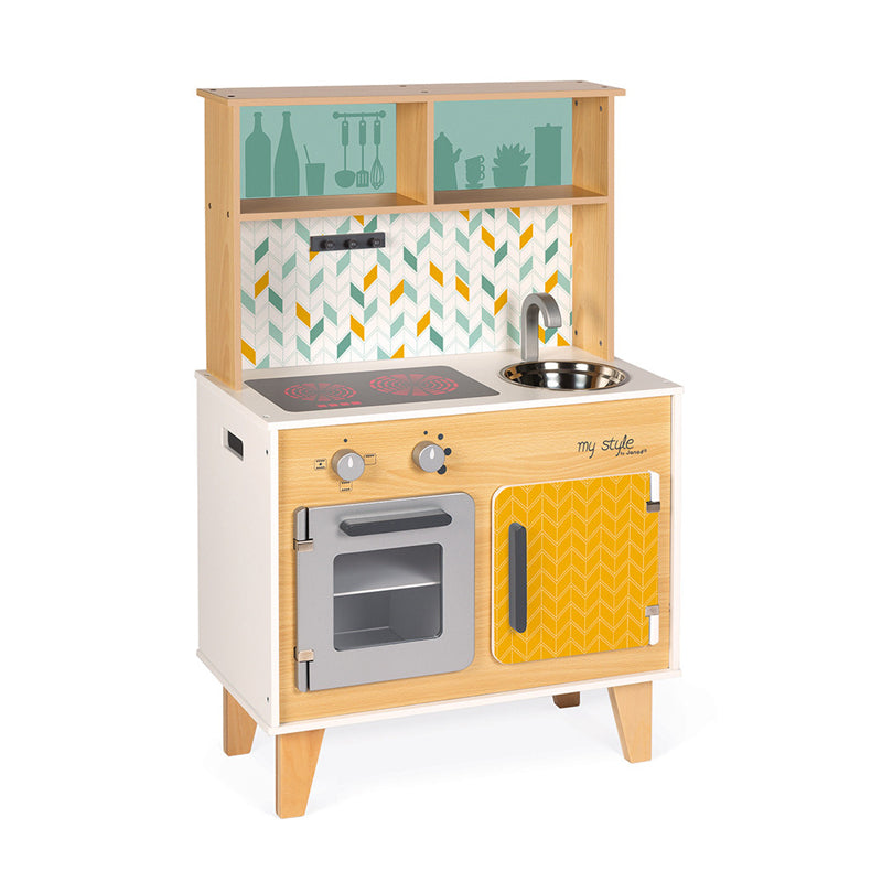 Assim como uma cozinha de verdade, a cozinha My Style tem um armário com uma prateleira, um forno com dois botões giratórios, efeitos sonoros, uma pia de aço inoxidável e um pino para pendurar utensílios de cozinha.