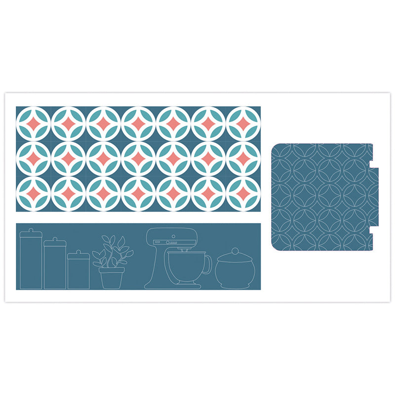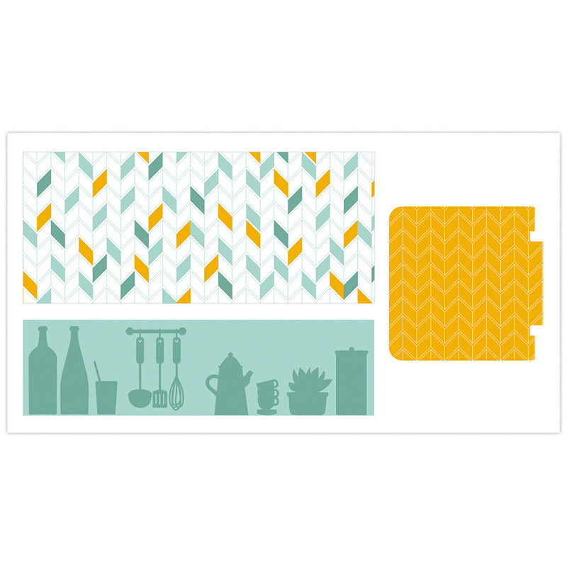 Autocolantes incluídos para personalizar o armário, o aparador e a porta superiores, com 2 temas. Coloque adesivos antes de montar a cozinha.