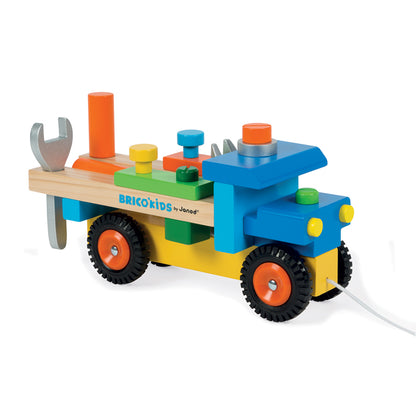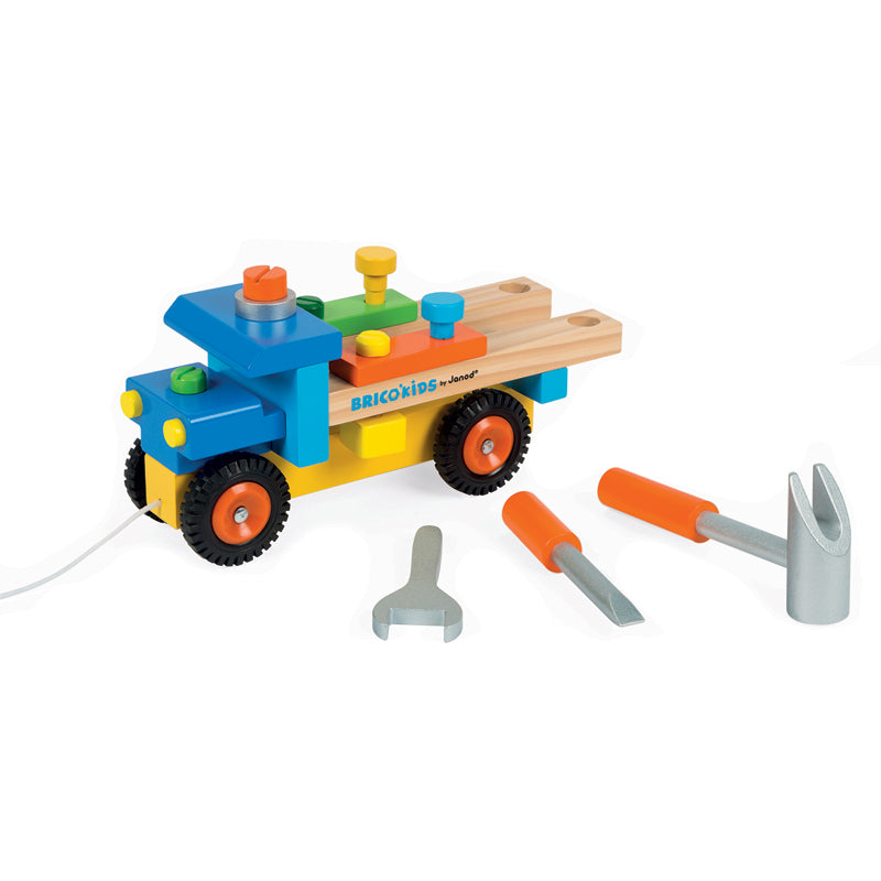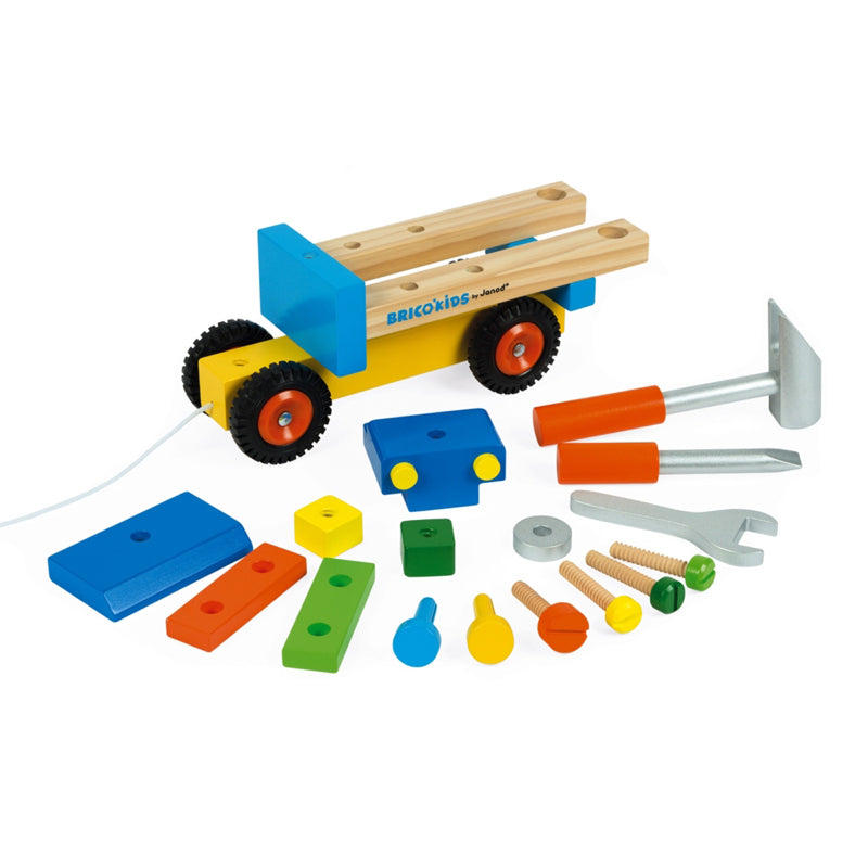 Desenvolvendo habilidades de concentração e construção, este caminhão de brinquedo de madeira vem com 3 ferramentas e 14 peças que podem ser combinadas para construir o caminhão de uma criança. A base do caminhão abriga eixos metálicos para as 4 rodas de plástico, bem como uma corda de puxar para que, uma vez feita, ela dobre como um puxão ao longo do brinquedo, incentivando as habilidades motoras.