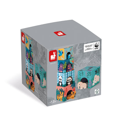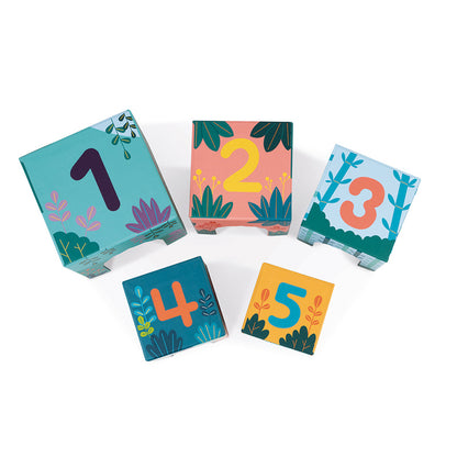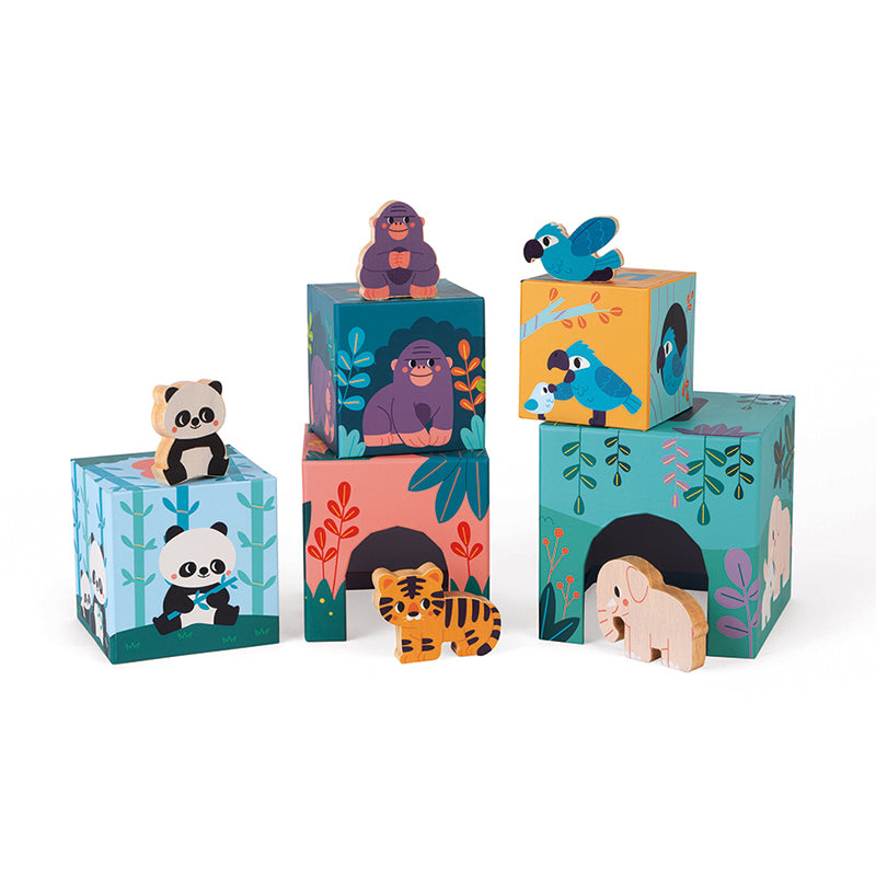 Cada bloco representa o habitat de um animal onde ele pode se esconder usando o orifício frontal. Os animais são organizados do maior ao menor: elefante, tigre, panda, orangotango, arara-azul e amarela, e os números de 1 a 5 são impressos no topo de cada bloco para ajudar as crianças a contar.