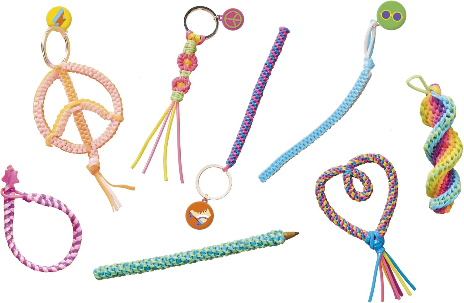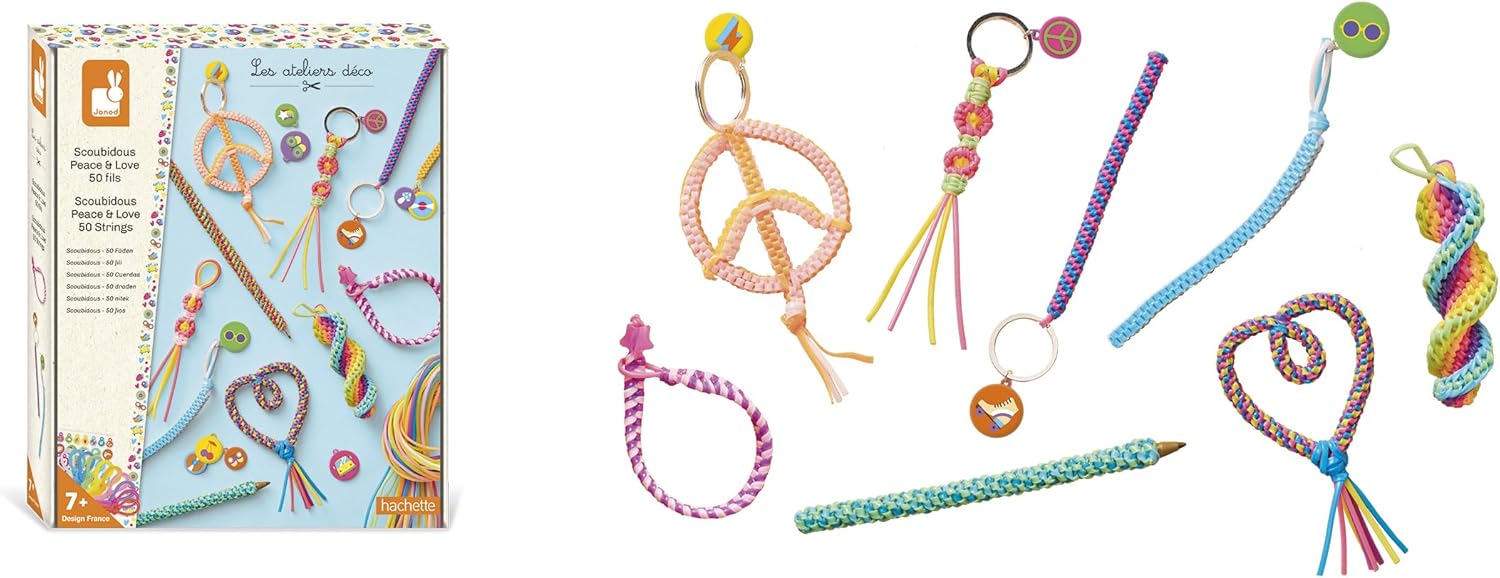 - KIT SCOUBIDOUS PAZ E AMOR: Este kit permite criar scoubidous clássicos ou originais com o tema Paz e Amor. Crianças a partir de 7 anos aprenderão a criar lindos objetos enquanto desenvolvem sua criatividade e paciência.