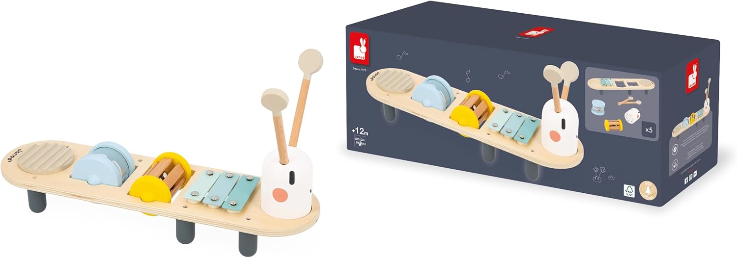 Janod - Suporte de atividades musicais Sweet Cocoon Caterpillar - 5 atividades sonoras infantis - Jogo do despertar musical - Brinquedo de madeira FSC - 12 meses +