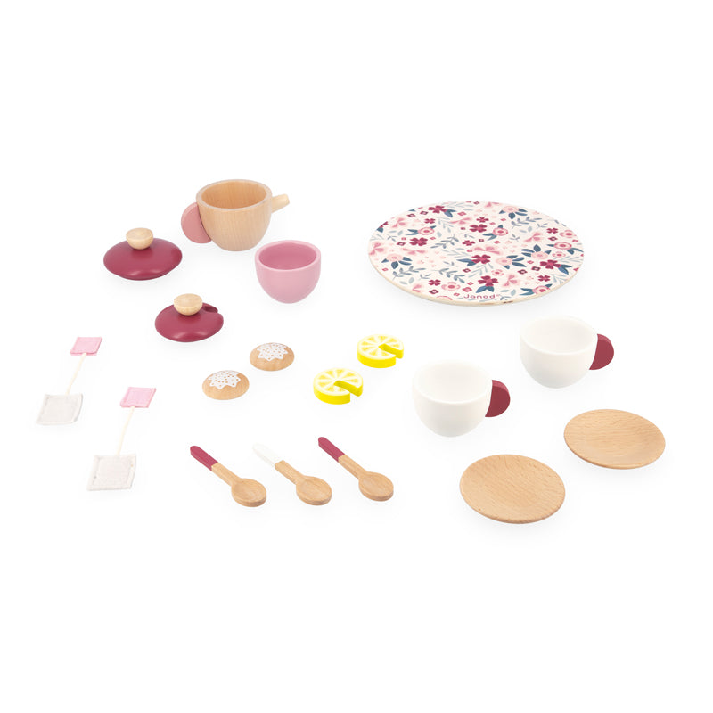Este conjunto é composto por um bule, um açucareiro, duas chávenas, dois pires e três colheres em madeira. Porque é importante adaptar-se aos gostos individuais, o seu filho terá 2 saquetas de chá de feltro, 2 rodelas de limão e 2 bolachas para satisfazer os seus convidados.
