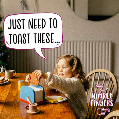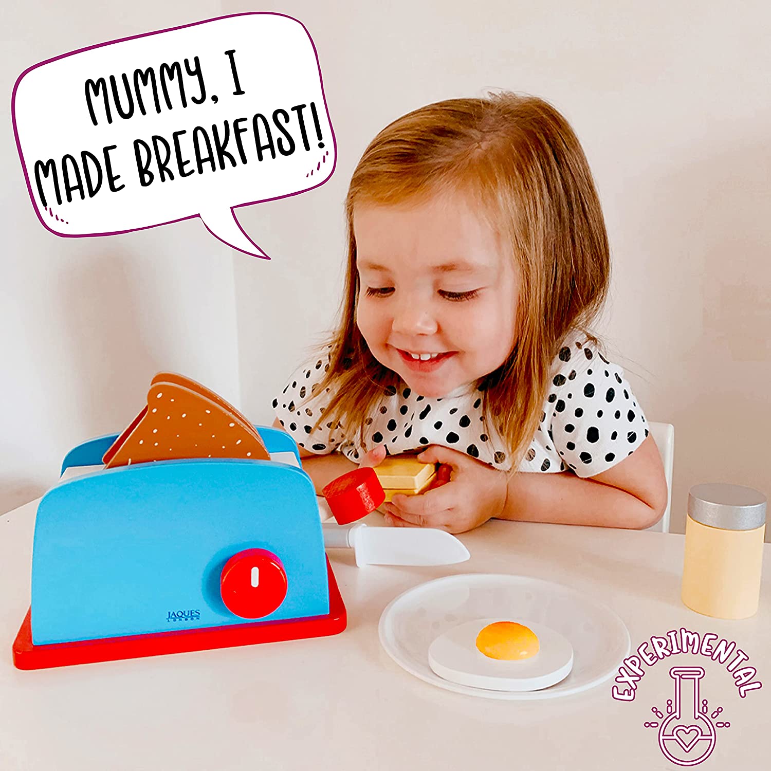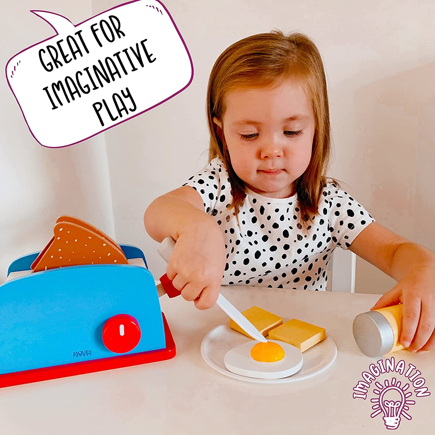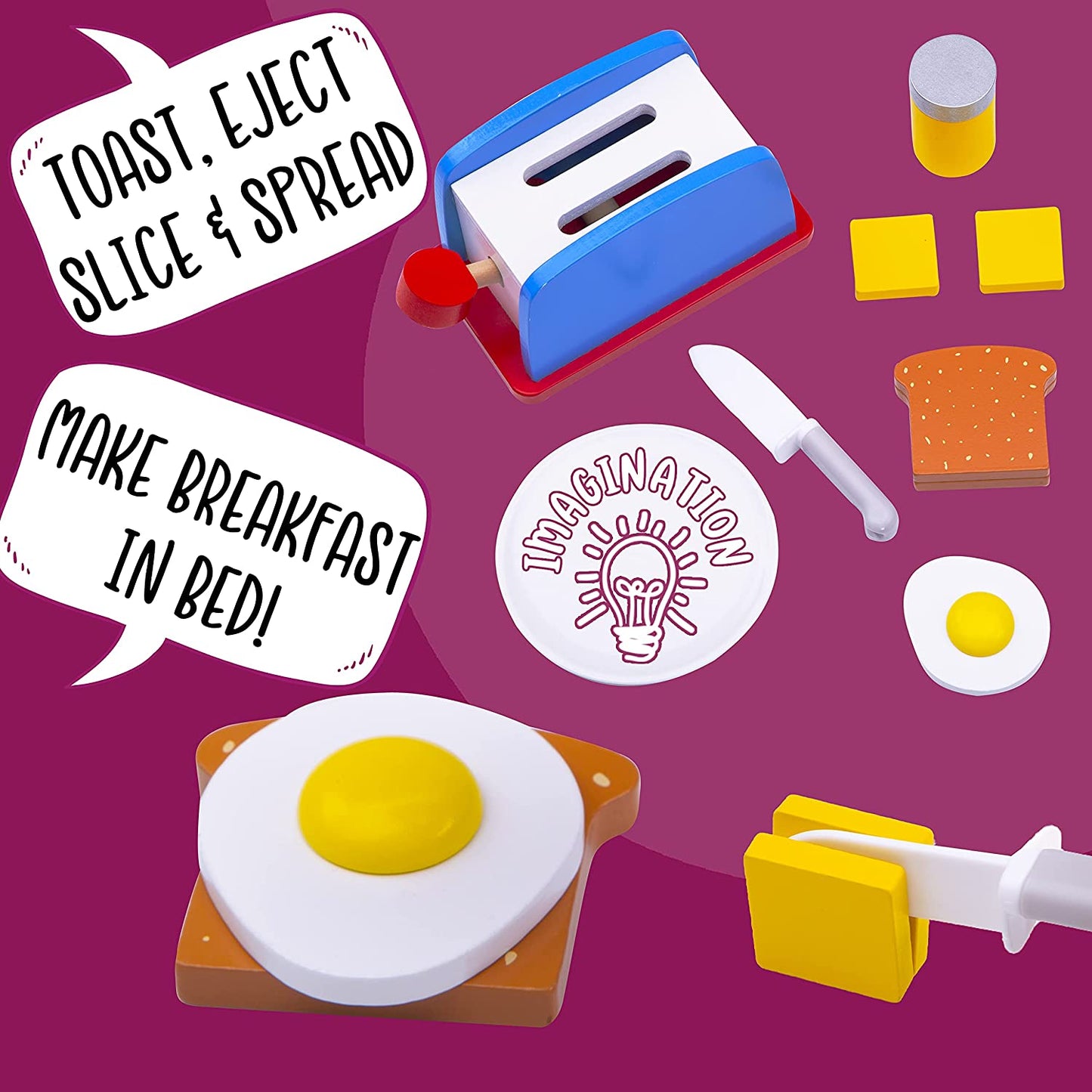 CONJUNTOS DE ALIMENTOS DE MADEIRA DE MADEIRA DE ALTA QUALIDADE PARA CRIANÇAS - Nossos alimentos para crianças são feitos de 100% de madeira aprovada pelo FSC e apresentam tinta à base de água para brincadeiras seguras. Seu papel para brincar inclui 2 pedaços de manteiga, uma torradeira, um ovo, sal e um prato e faca - brinquedos de cozinha, comida de brinquedo para crianças e mantimentos de brinquedo feitos para durar