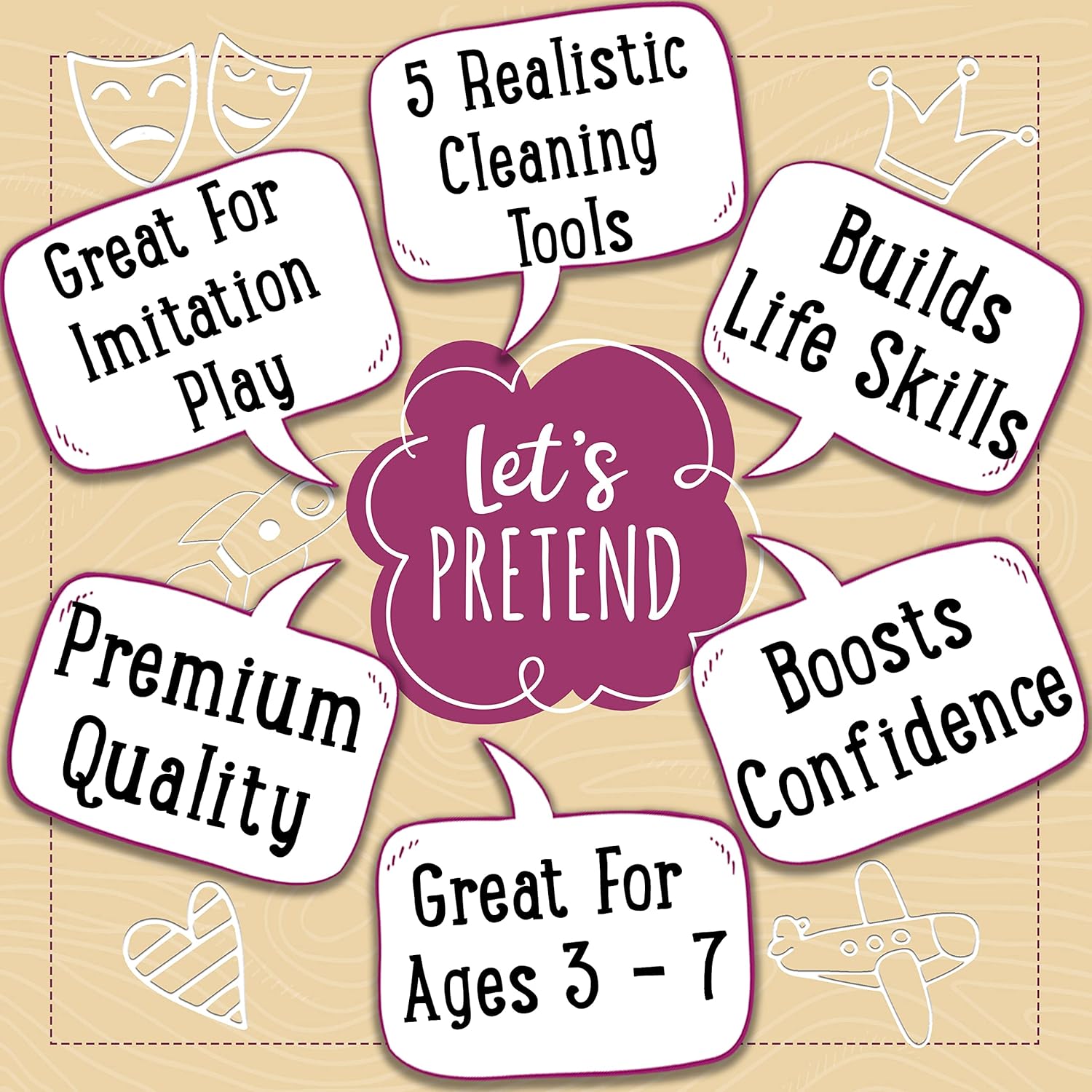 - Conjunto de Limpeza Durável: Este conjunto de limpeza é feito com materiais de madeira de alta qualidade, garantindo durabilidade e longevidade. É perfeito para brinquedos infantis a partir de 2 anos, proporcionando horas de limpeza e diversão com brincadeiras de faz de conta.