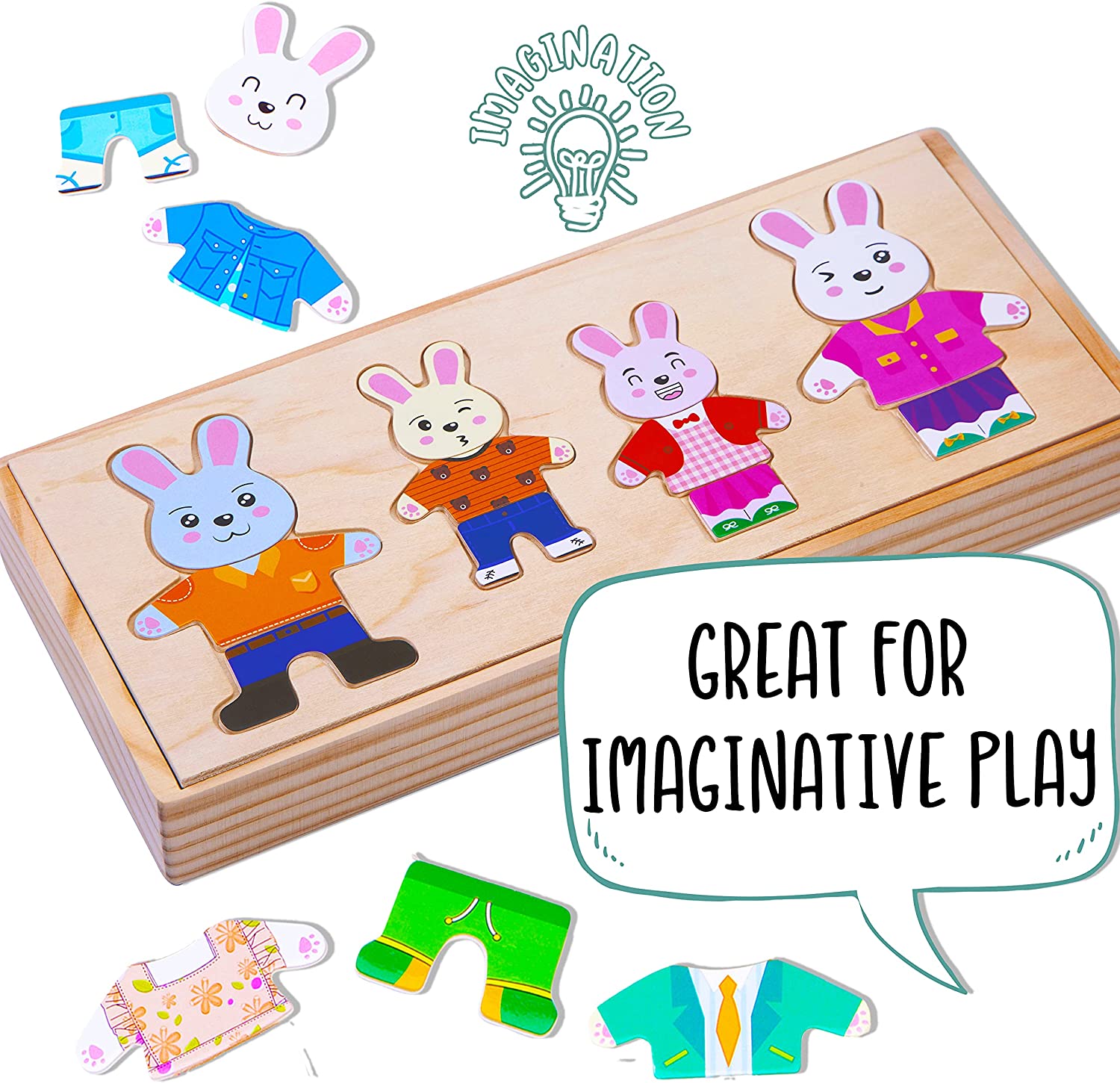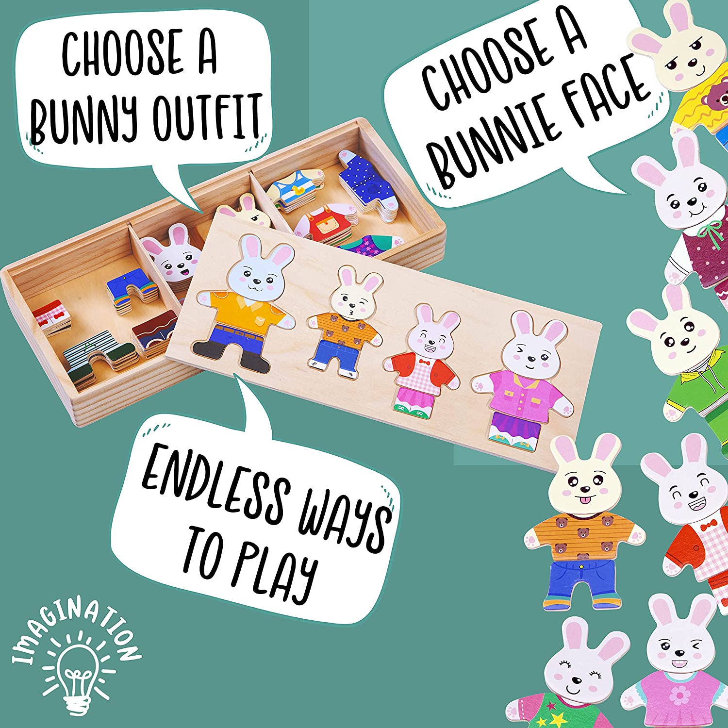 Brinquedos de madeira | Incentive a criatividade e a liberdade no jogo. Use os nossos Bunny Dress Up Wooden Toys para experimentar moda, cores e emoções - Brinquedos para crianças ideais para a AUTO-EXPRESSÃO e explorar o bem-estar emocional - Brinquedos Educativos Montessori para meninas e meninos.