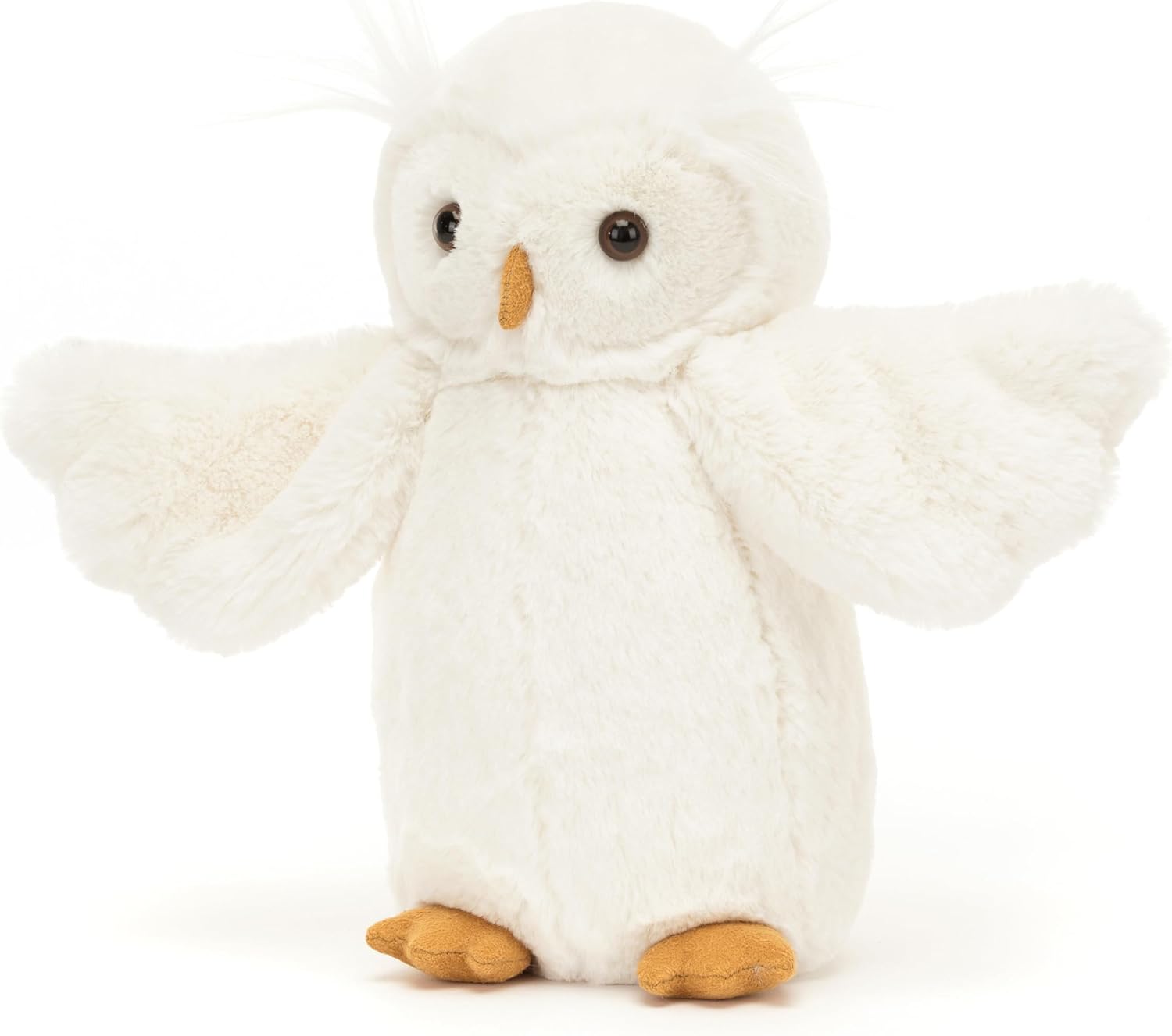 Jellycat Coruja Tímida (Média) – uma amiga da floresta, linda, macia e doce, pronta para voar para o seu coração. Com suas penas cinzas macias e sedosas, asas vibrantes e curiosos olhos âmbar, esta coruja de pelúcia é a mistura perfeita de aconchego e fofura.