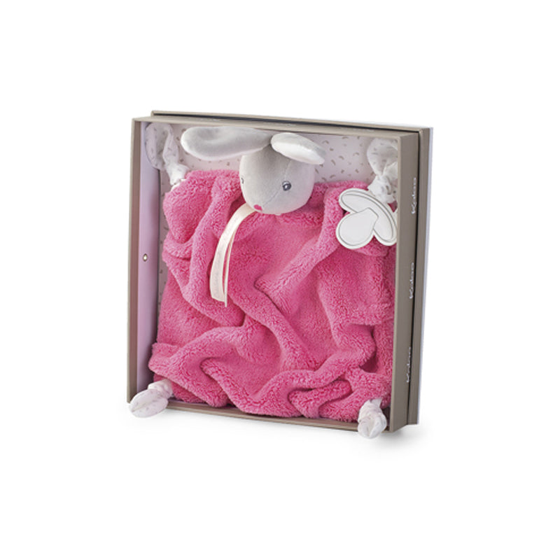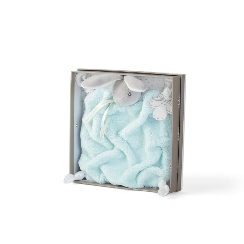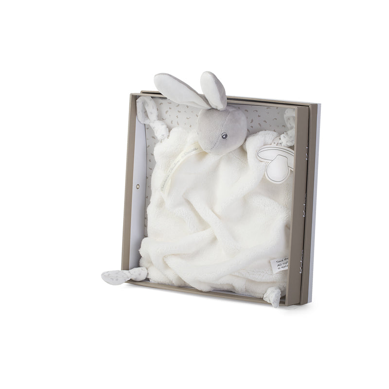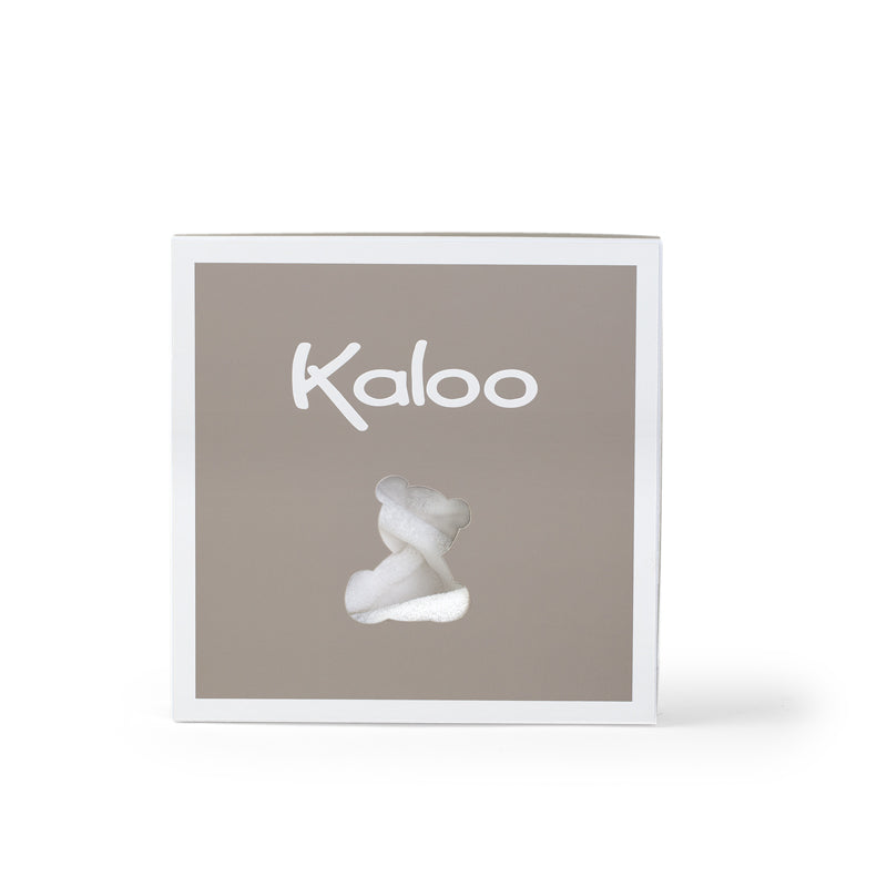 Este doudou está lindamente embalado em uma caixa quadrada de 22,6 x 22,6 cm. Um urso Kaloo cortado dá uma olhada dentro da caixa para que você possa ver a cor branca do doudou dentro, mesmo quando a caixa está fechada.