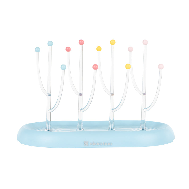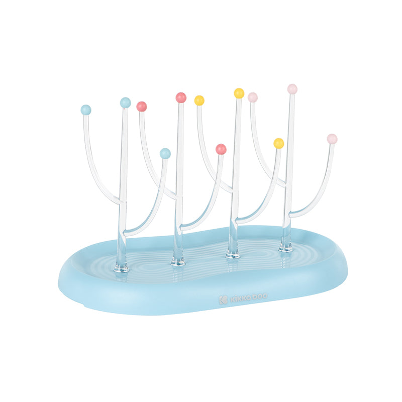 Este moderno escorredor de bancada possui 4 hastes transparentes, cada uma com 2 ramos transparentes adicionais, todos cobertos com uma variedade de bolas coloridas nas quais os acessórios de bebês podem ser colocados para secar.