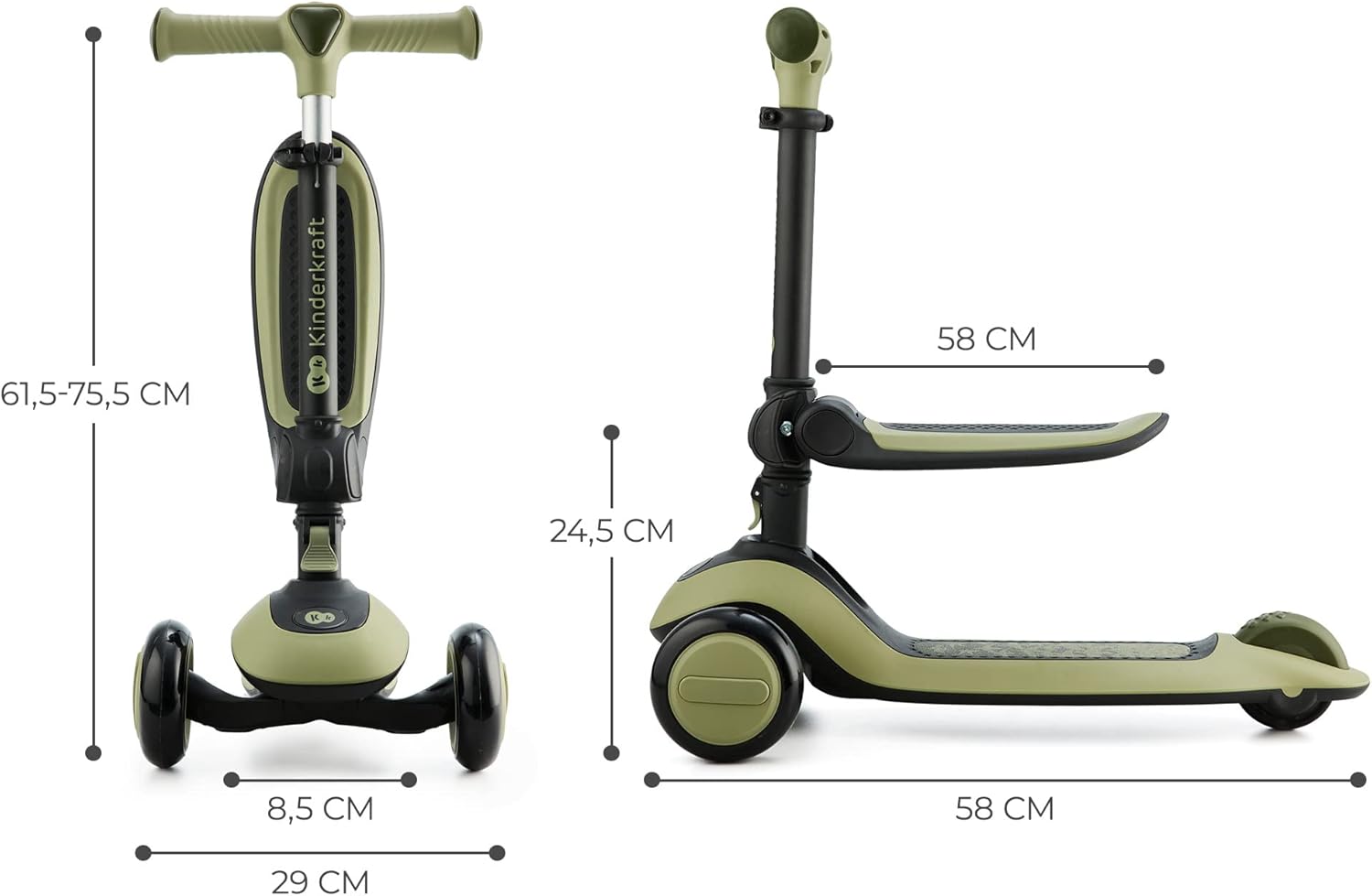 Kinderkraft Scooter Halley 2 em 1 para crianças de 1+ anos até 50 kg, scooter de 3 rodas, bicicleta de equilíbrio, fácil de dobrar, 2 rodas dianteiras piscantes, guidão ajustável, fácil de manusear, pesa apenas 3 kg, verde