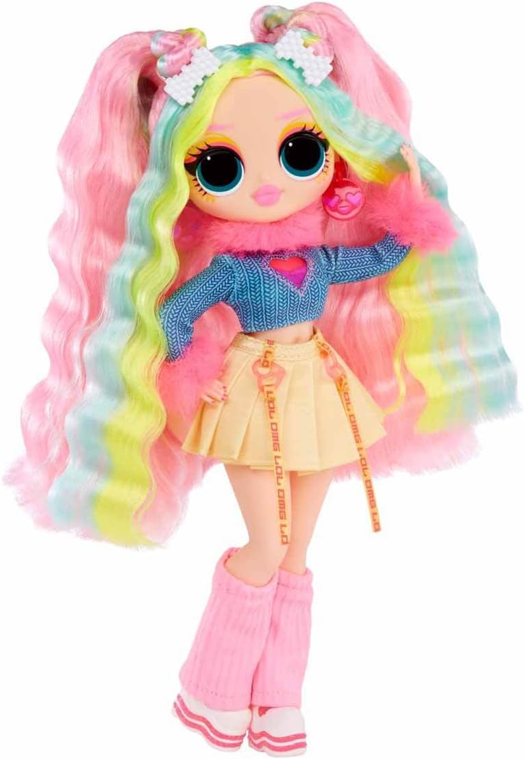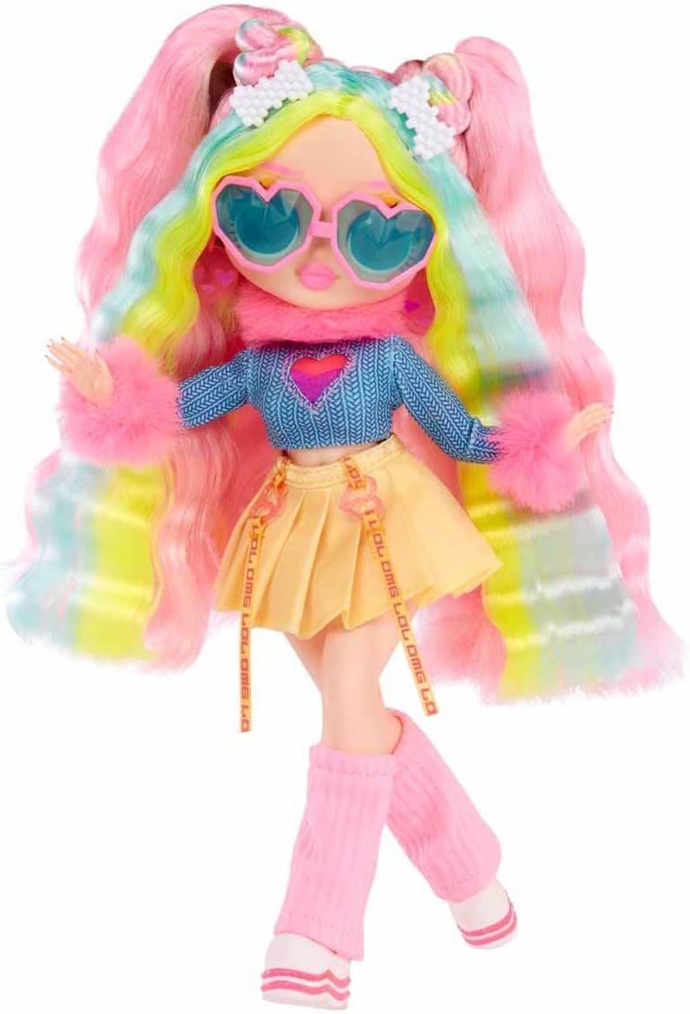 UNBOX MÚLTIPLAS SURPRESAS - Inclui uma boneca da moda OMG Sunshine Makeover, roupas ferozes, sapatos, polainas, acessórios, óculos em forma de coração, brincos de emoji, uma escova de cabelo e um suporte de boneca