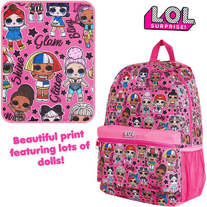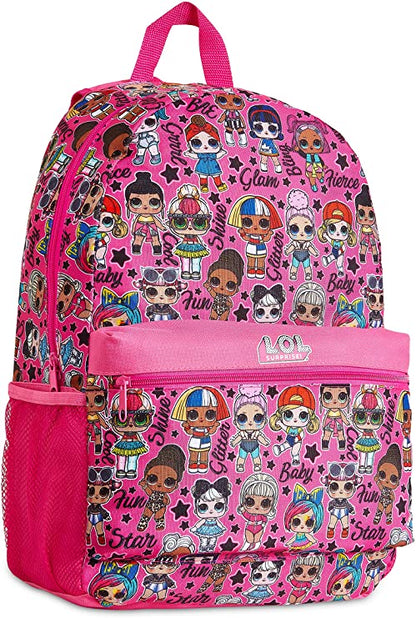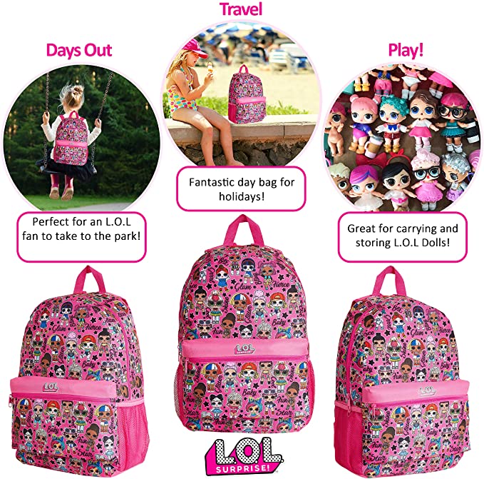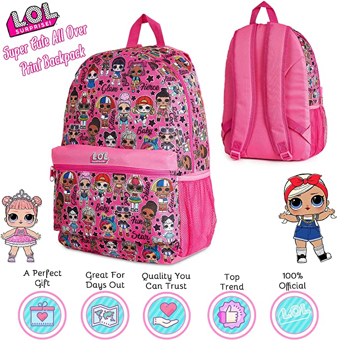 LOL SURPRISE SCHOOL BAG --- O melhor presente para os fãs de bonecas lol omg! Esta linda mochila é perfeita para a escola, esportes ou viagens e apresenta suas bonecas lol favoritas em uma impressão de alta resolução. Estas mochilas são mochilas escolares totalmente licenciadas 100% genuínas para meninas com design de alta qualidade, material de primeira qualidade e puxadores de zíper de marca.