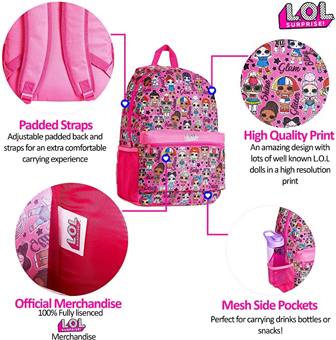 MERCADORIA OFICIAL - EDIÇÃO LIMITADA --- Esta linda bolsa escolar rosa para meninas com uma bela estampa de suas bonecas lol favoritas foi projetada e fabricada exclusivamente para as lojas F & F e está disponível apenas em edição limitada. Nossas bolsas para meninas fazem parte da Lol Surprise Merchandise oficial. Não perca!