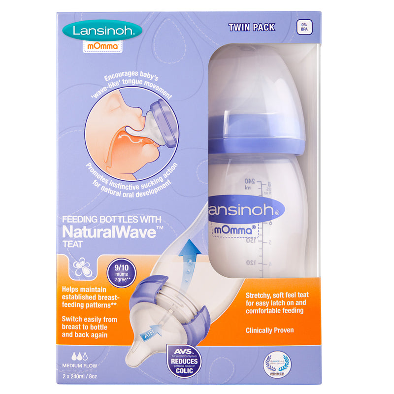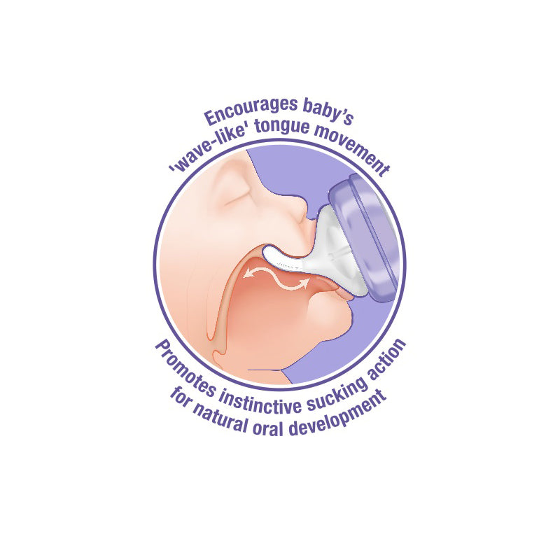 Uma extensa pesquisa revelou que o estilo de sucção de um bebê é muito diferente do de um adulto e envolve três etapas principais. Estas são a pega inicial, o movimento peristáltico da língua (em que a língua do bebê se move em um movimento ondulatório) e a deglutição. É muito importante que o bebê seja capaz de realizar o movimento peristáltico da língua, pois isso estimula o desenvolvimento oral e mandibular natural. O bico de mamadeira NaturalWave de Lansinoh é clinicamente comprovado por encorajar este padrão natural de alimentação.