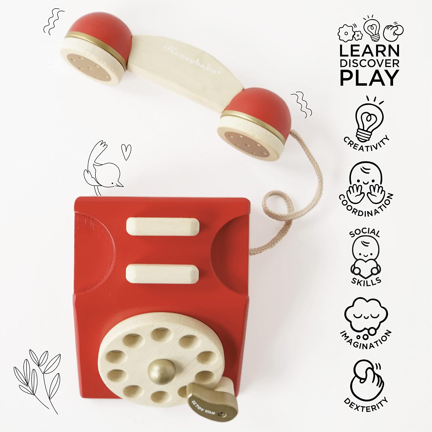 - ESTILO RETRO BONITAMENTE CONSTRUÍDO: Seu filho vai adorar este brinquedo de simulação de papel de telefone de madeira. Apresentando uma campainha dentro do aparelho para diversão de dramatização. Dígitos escritos e roda giratória realista incentivam o reconhecimento de números. Feito de madeira de seringueira pintada no icônico vermelho e com acabamento com um toque de ouro luxuoso.
