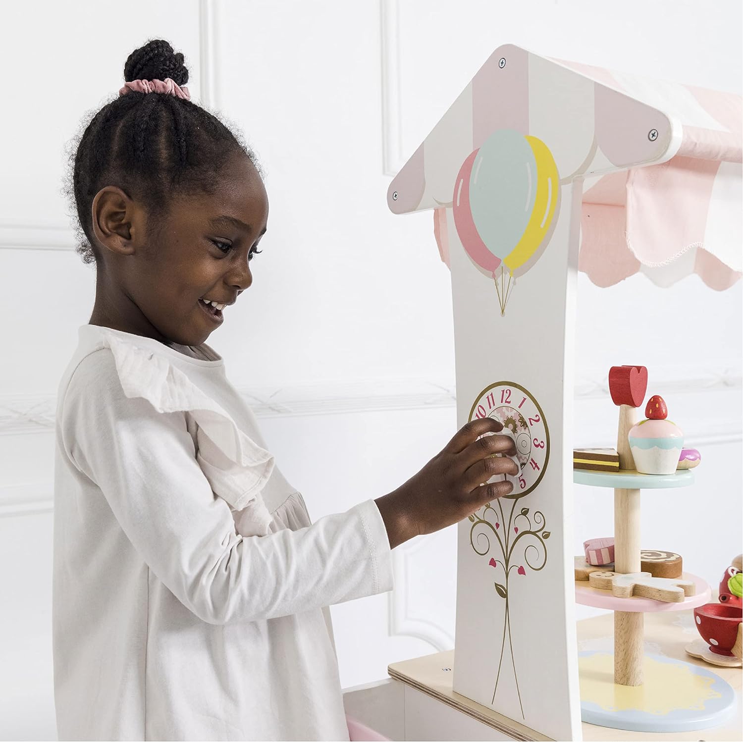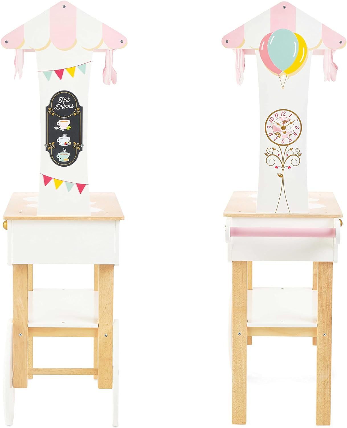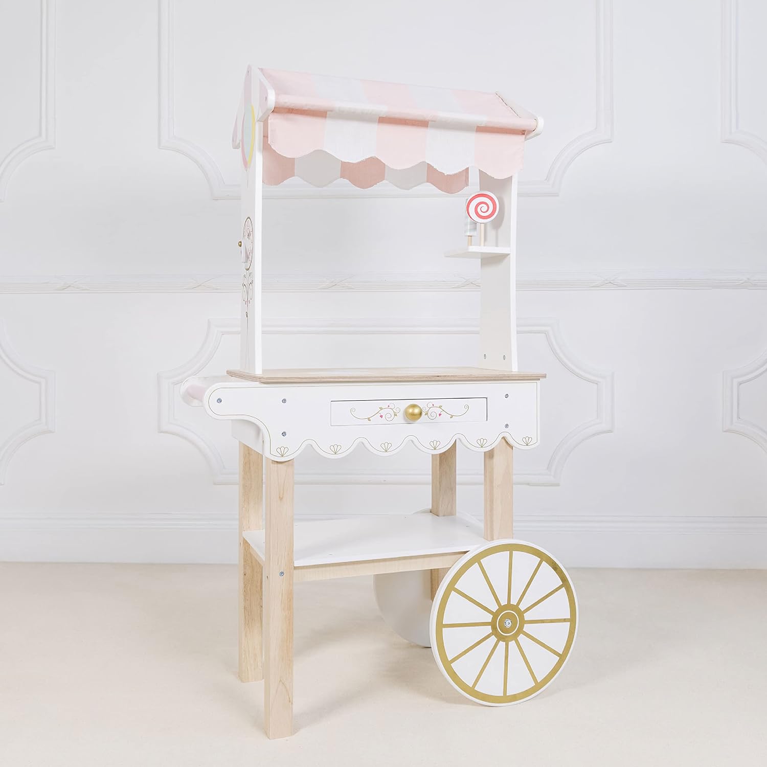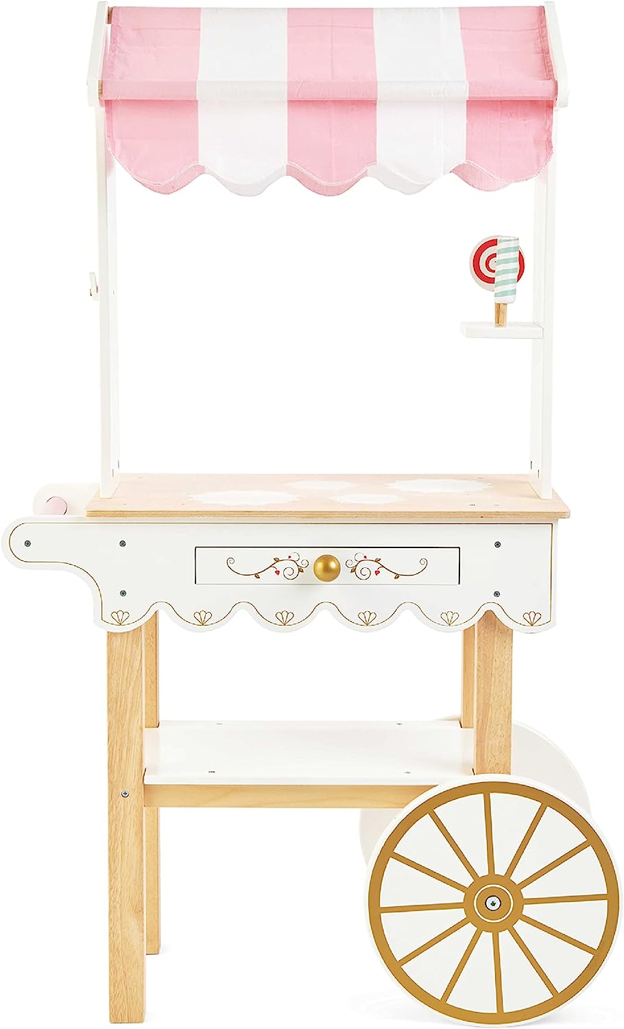 - ESTILO RETRO BONITAMENTE CONSTRUÍDO: Decorado com um dossel de tecido listrado rosa e branco e com uma gaveta secreta, este lindo carrinho de chá de faz de conta é o conjunto de brinquedos perfeito para meninos e meninas. Inclui um carrinho clássico estilo carrinho de mão com duas rodas e alça.