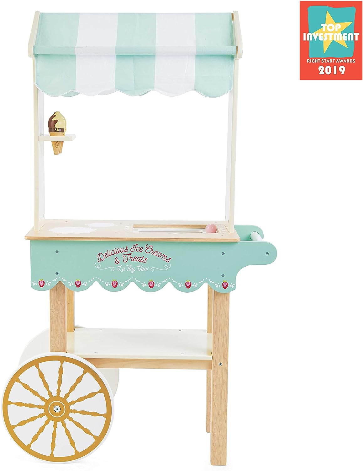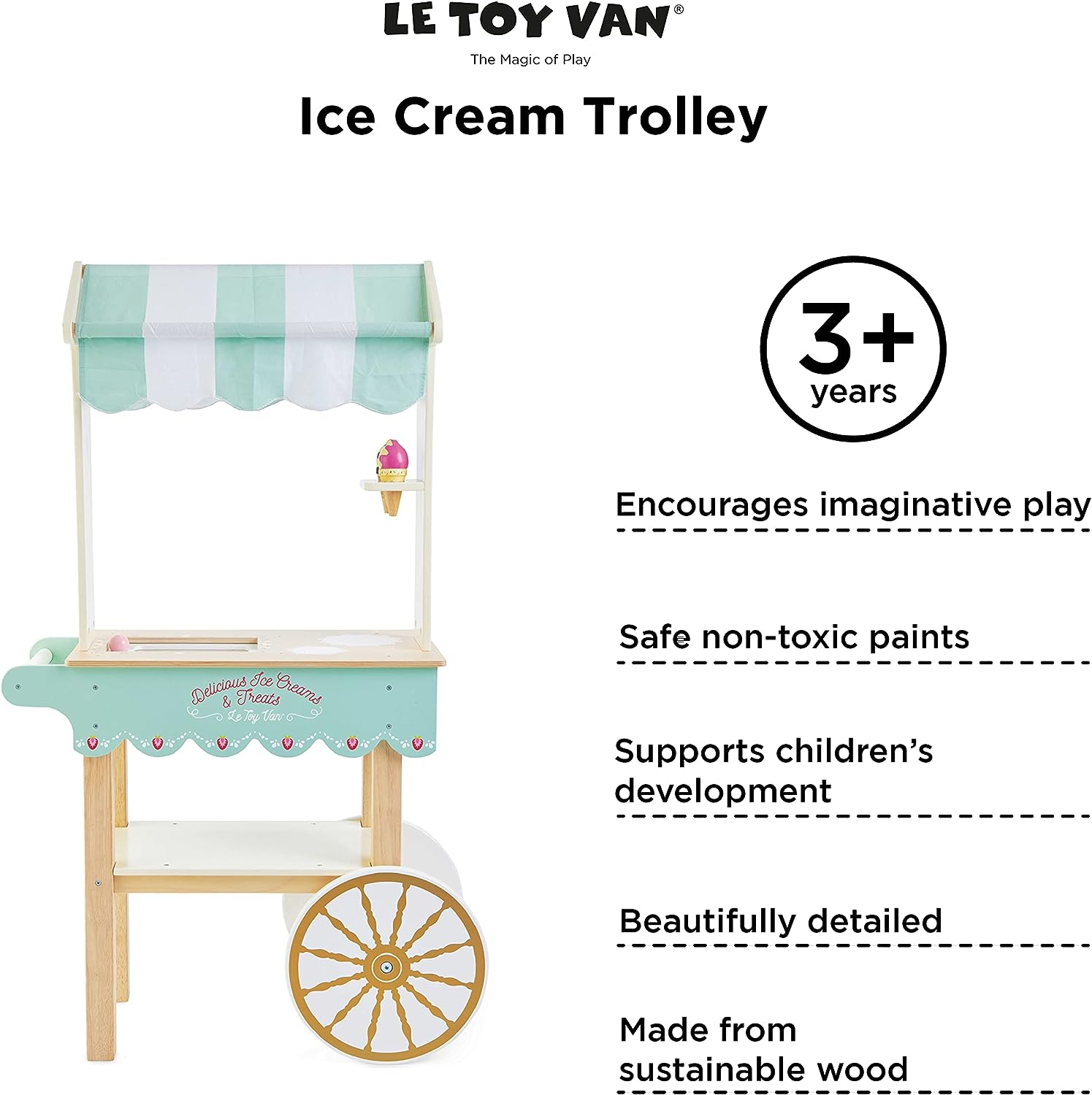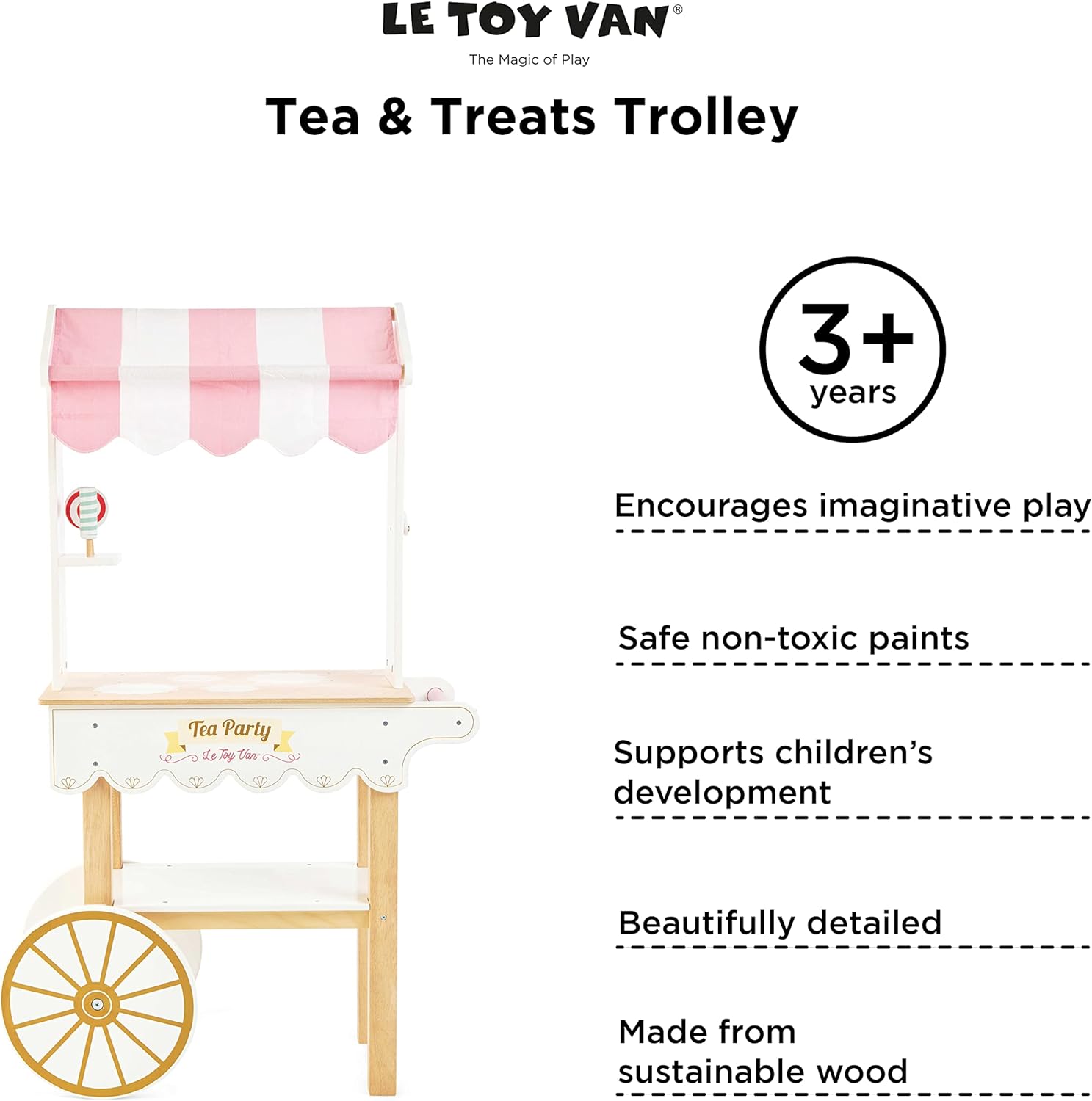 - ÓTIMO PRESENTE PARA PEQUENOS DE 3 ANOS OU MAIS: Seu filho vai adorar o chá da tarde com este lindo carrinho de chá e bolo de brinquedo. Vem com menus de bebidas e bolos deliciosamente ilustrados em ambos os painéis laterais. Alimentos de brinquedo adicionais da coleção Honey Bake da Le Toy Van são vendidos separadamente.
