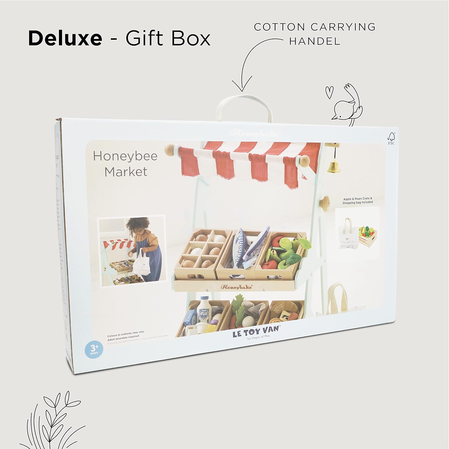 - DEIXE SEU FILHO CONSTRUIR A LOJA DOS SONHOS: A barraca do Honeybee Market é um excelente acompanhamento para outros brinquedos de madeira da linha de lojas da Le Toy Van - incluindo carrinho de compras, caixa registradora de brinquedos, balanças e seleção de brinquedos de caixa de comida de madeira. Todos vendidos separadamente.