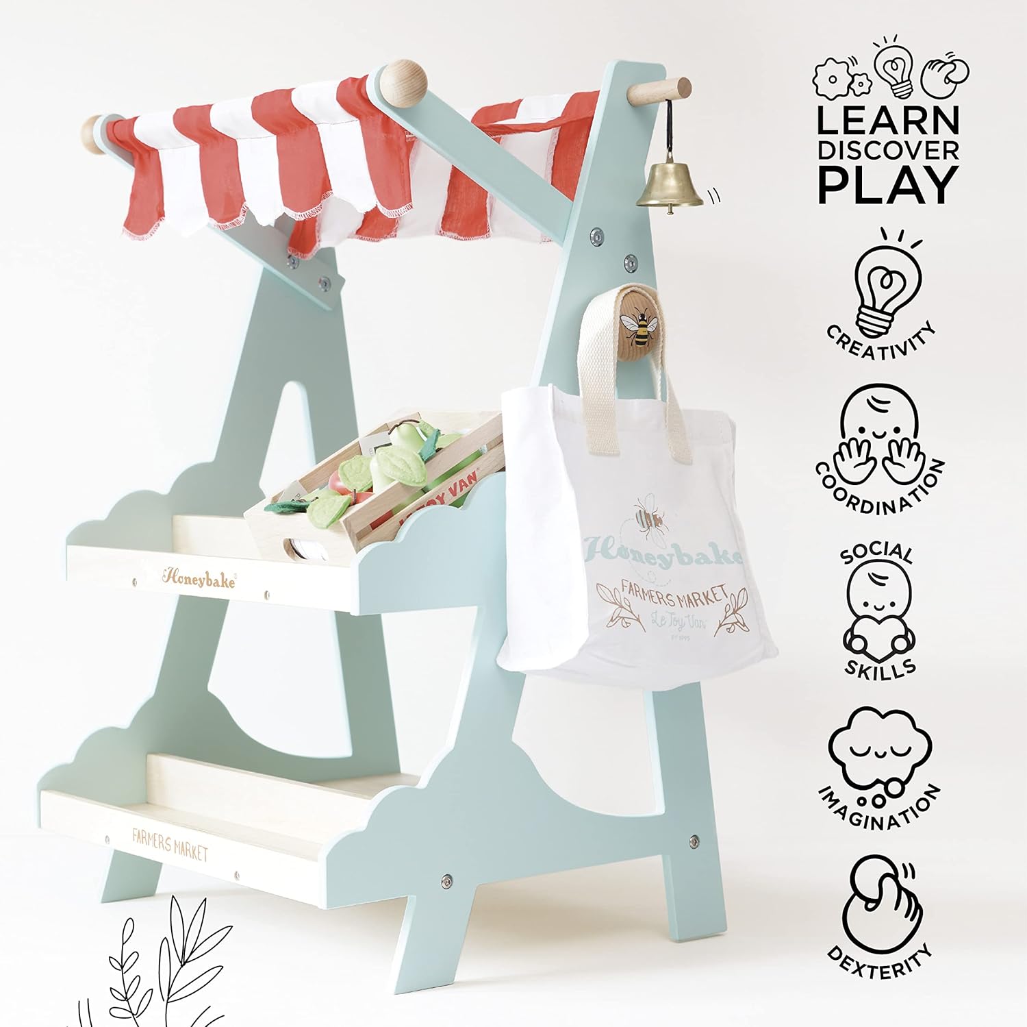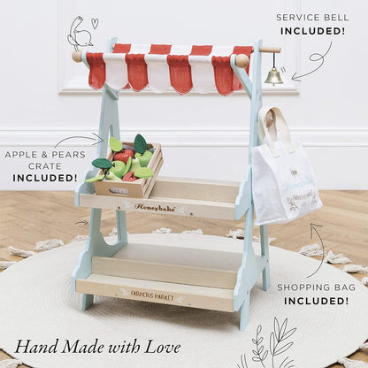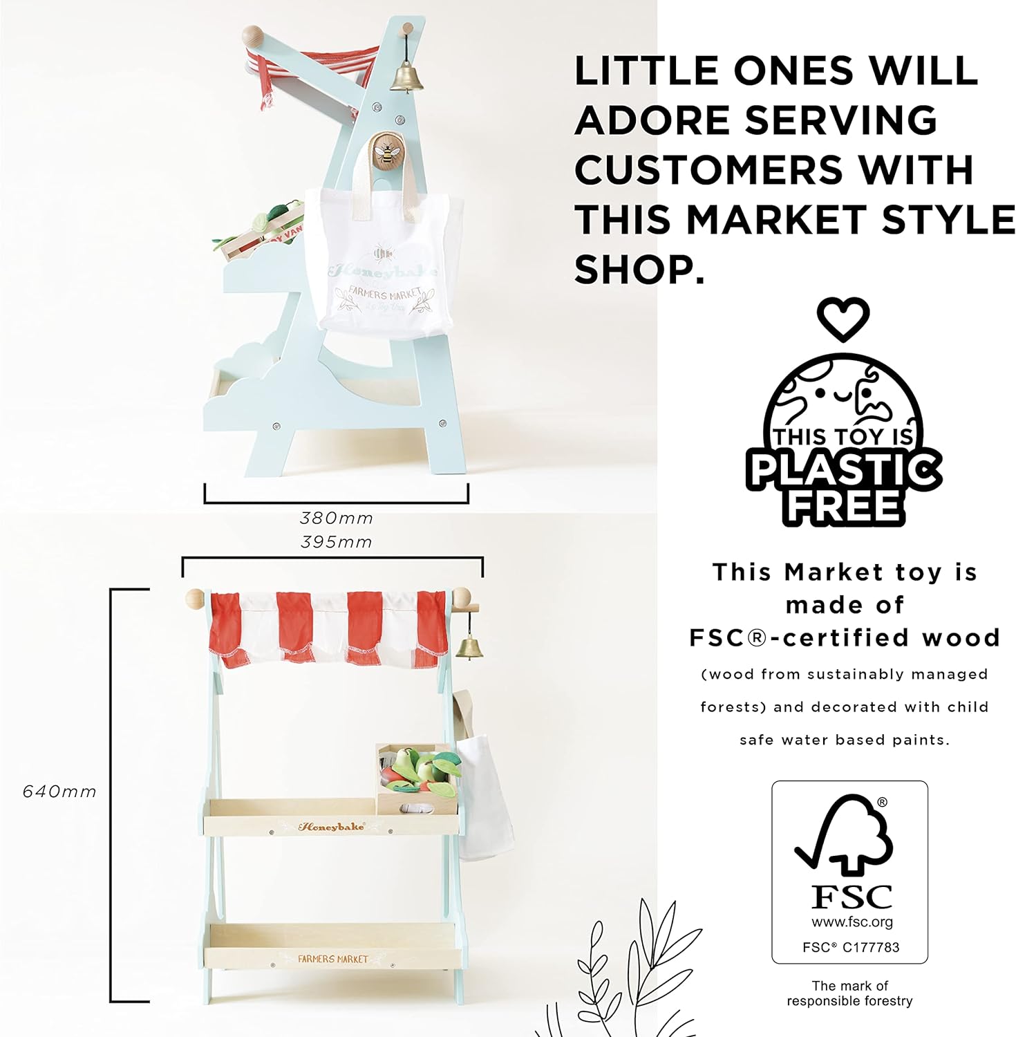 - PERMITE DIVERSÃO DE LONGA DURAÇÃO, ENQUANTO CUIDA DO PLANETA: Feito de seringueira durável e sustentável, este conjunto de barraca de mercado de madeira lindamente pintada com um dossel de tecido, inclui uma caixa de maçãs e peras de madeira e uma sacola de compras de tecido.