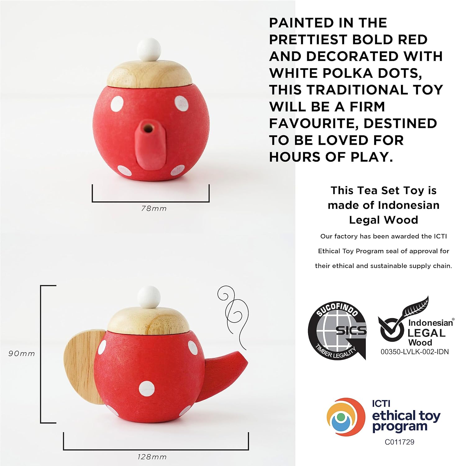 - BRINQUEDO SEGURO: Decorado com tintas atóxicas e testado de acordo com os mais altos padrões de segurança. Usando materiais naturais, incluindo madeira de borracha lisa de qualidade legal reabastecível e uma variedade de técnicas, desde serigrafia manual até coloração com água, esses brinquedos detalhados feitos à mão são únicos e amados pelas crianças. Inclui duas xícaras de chá com pires, um bule com saquinho de chá para colocar, uma jarra de leite, uma colher de chá e um bolo de tecido coberto com morangos, tudo em uma deliciosa bandeja.