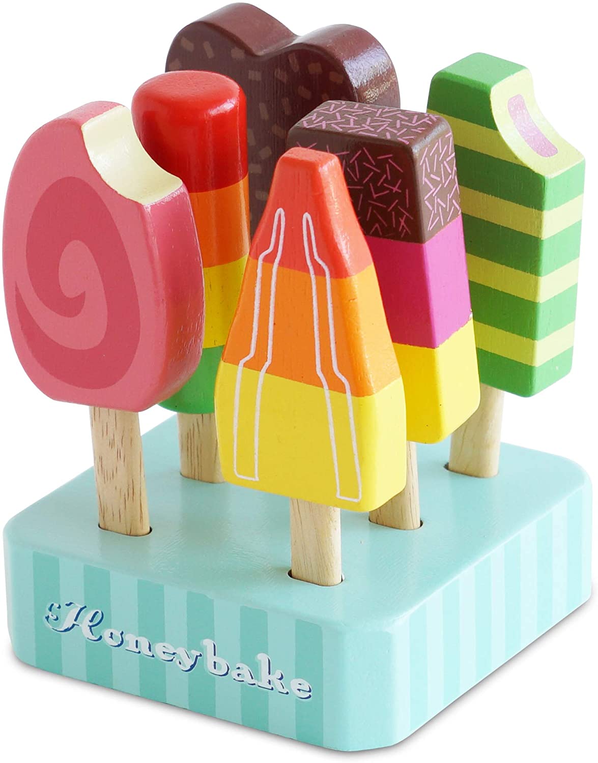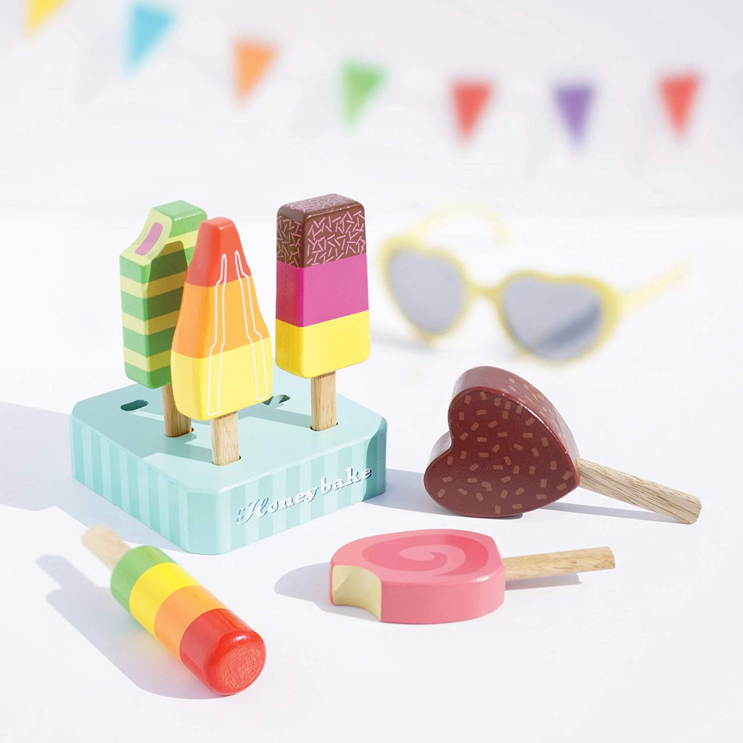 CONJUNTO DE PEÇAS DE GELO EDUCACIONAL COLORIDO DE 6 PEÇAS: O brinquedo educativo de madeira Honeybake Pirulitos de gelo finge Play Kids Playset inclui 6 picolés de madeira pintados com cores vivas, completos com suporte de madeira resistente para armazenamento conveniente. Esta envolvente experiência de brincar de faz de conta oferece às crianças uma alternativa social divertida às telas.