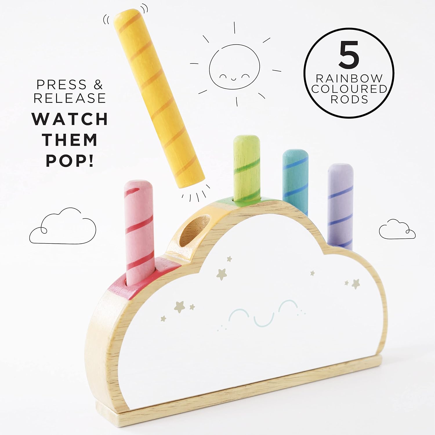 - POP!: Le Toy Van criou lindos brinquedos educativos como esta sólida nuvem de madeira com mola, com cinco hastes coloridas de arco-íris pop-up (em três alturas). O brinquedo push and pop incentiva a aprendizagem precoce através da brincadeira, pois desenvolve a coordenação olho-mão e a confiança.